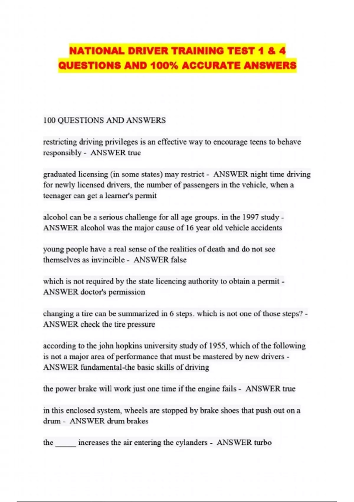 NATIONAL DRIVER TRAINING TEST 1 & 4 QUESTIONS AND 100% ACCURATE ANSWERS