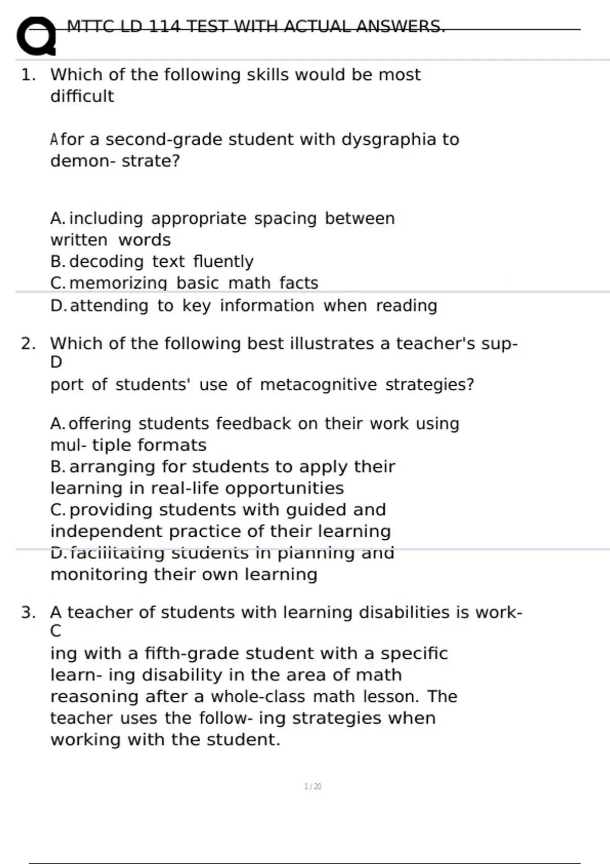 MTTC LD 114 TEST WITH ACTUAL ANSWERS. 1. Which of the following skills would be most difficult A for a second-grade student with dysgraphia to demon- strate? A. including appropriate spacing between written words B. decoding text fluently C. memorizing basic math facts D. attending to key information when reading 2. Which of the following best illustrates a teacher's sup- D port of students' use of metacognitive strategies? A. offering students feedback on their work using mul- tiple formats B. arranging for students to apply their learning in real-life opportunities C. providing students with guided and independent practice of their learning D. facilitating students in planning and monitoring their own learning 3. A teacher of students with learning disabilities is work- C ing with a fifth-grade student with a specific learn- ing disability in the area of math reasoning after a whole-class math lesson. The teacher uses the follow- ing strategies when working with the student. *repeating instruction for the student using simplified math problems *conducting a "think aloud" of the problem being solved *modeling steps used to solve the problem *guiding the student in thinking through and solving a similar problem The teacher's use of these strategies best illustrates application of: A. inquiry learning. B. task analysis. C. scaffolded instruction. D. summative assessment. 4. A high school student identified with delays in motor D planning and metacognition would likely experience the most difficulty with: A. paying attention during a whole-class lecture. B. using visual supports to understand new content. C. understanding the meaning of commonly used vo- cabulary. D. applying a learned strategy to a specific task.