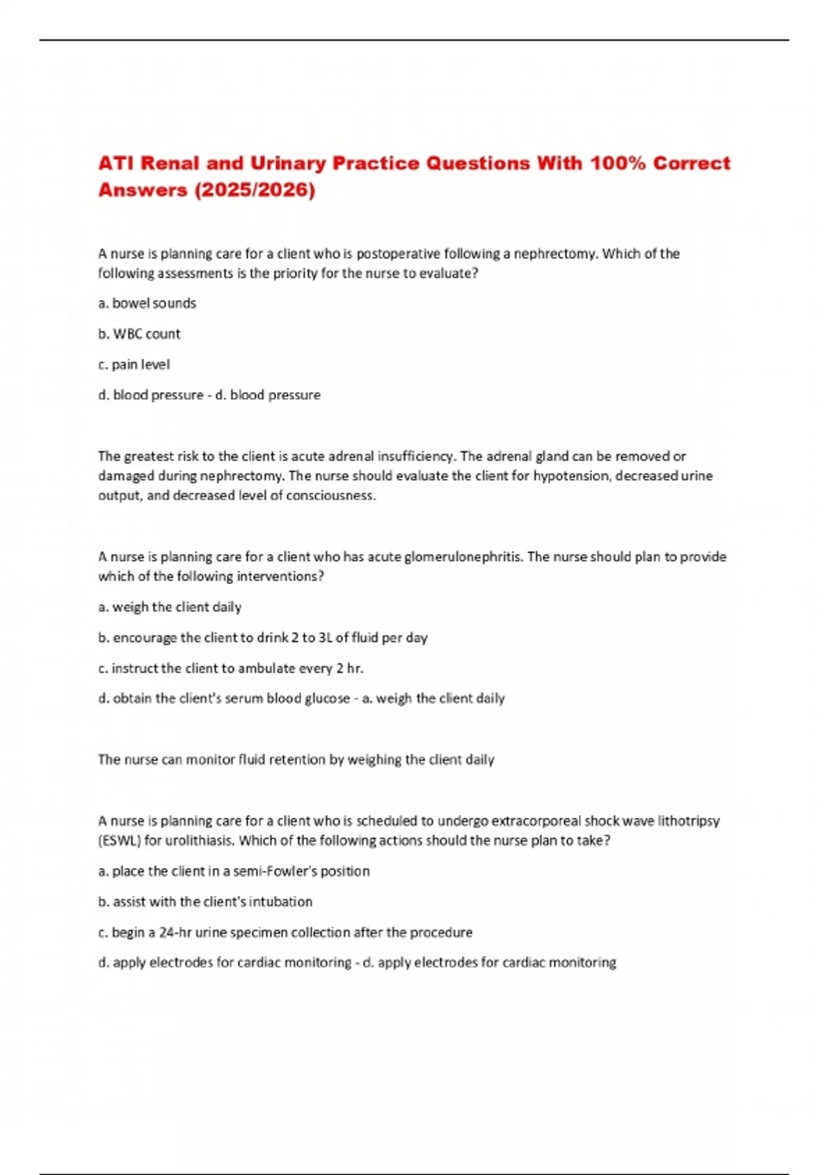 ATI Renal and Urinary Practice Questions With 100% Correct Answers (2025/2026)