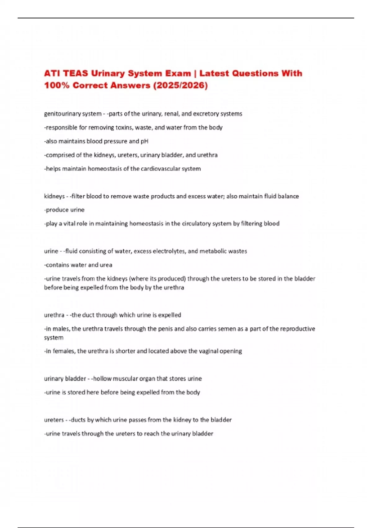 ATI TEAS Urinary System Exam | Latest Questions With 100% Correct Answers (2025/2026)