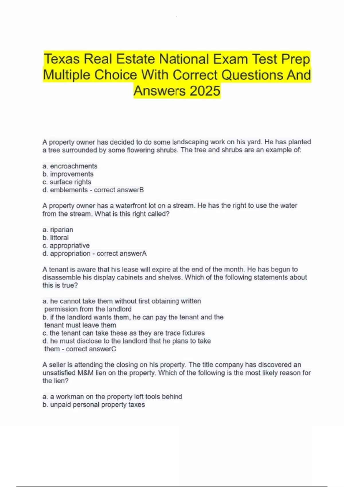 Texas Real Estate National Exam Test Prep Multiple Choice With Correct Questions And Answers 2025
