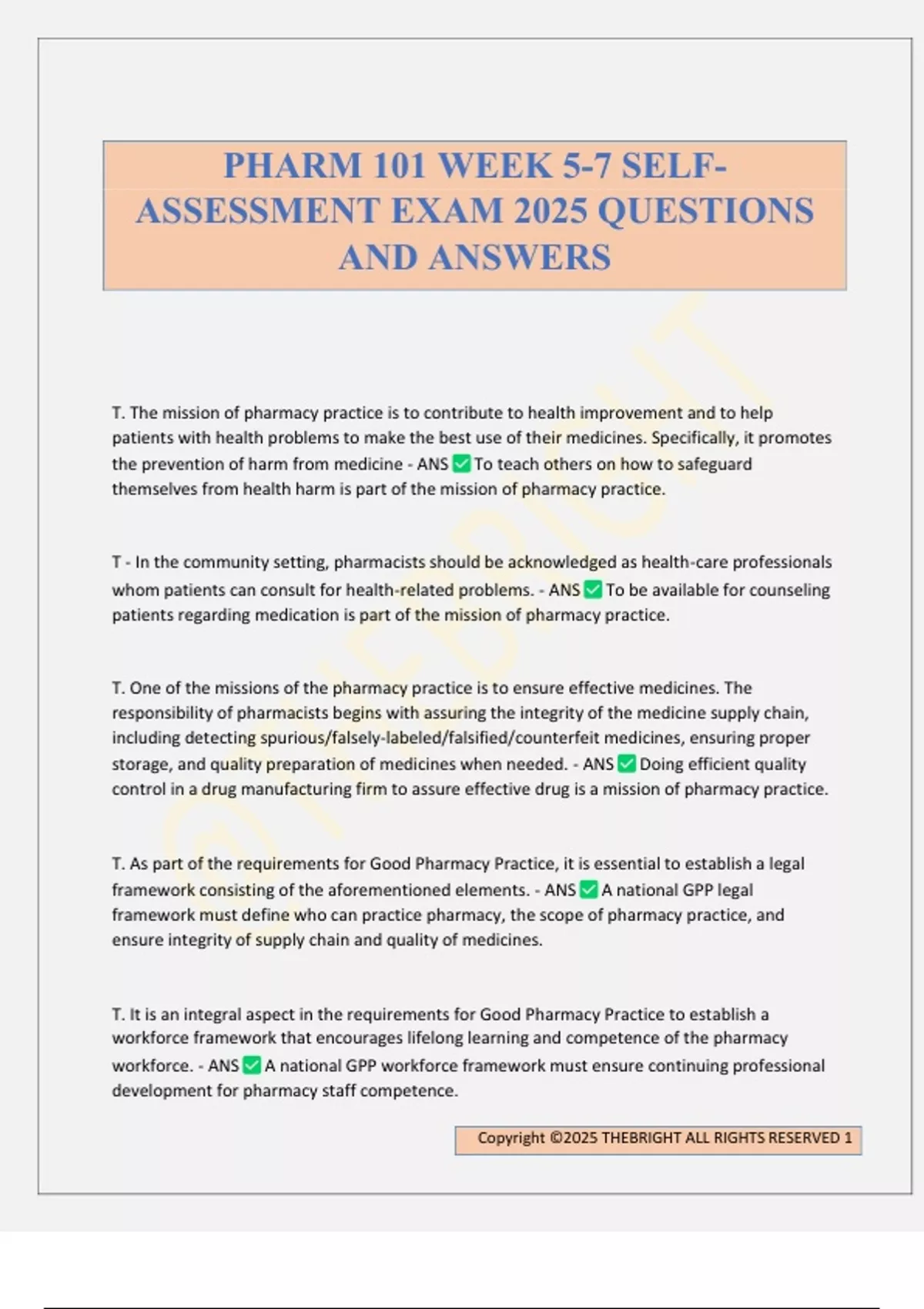 T. The mission of pharmacy practice is to contribute to health improvement and to help patients with health problems to make the best use of their medicines. Specifically, it promotes the prevention of harm from medicine - ANS To teach others on how to safeguard themselves from health harm is part of the mission of pharmacy practice. T - In the community setting, pharmacists should be acknowledged as health-care professionals whom patients can consult for health-related problems. - ANS To be available for counseling patients regarding medication is part of the mission of pharmacy practice. T. One of the missions of the pharmacy practice is to ensure effective medicines. The responsibility of pharmacists begins with assuring the integrity of the medicine supply chain, including detecting spurious/falsely-labeled/falsified/counterfeit medicines, ensuring proper storage, and quality preparation of medicines when needed. - ANS Doing efficient quality control in a drug manufacturing firm to assure effective drug is a mission of pharmacy practice. T. As part of the requirements for Good Pharmacy Practice, it is essential to establish a legal framework consisting of the aforementioned elements. - ANS A national GPP legal framework must define who can practice pharmacy, the scope of pharmacy practice, and ensure integrity of supply chain and quality of medicines. T. It is an integral aspect in the requirements for Good Pharmacy Practice to establish a workforce framework that encourages lifelong learning and competence of the pharmacy workforce. - ANS A national GPP workforce framework must ensure continuing professional development for pharmacy sta