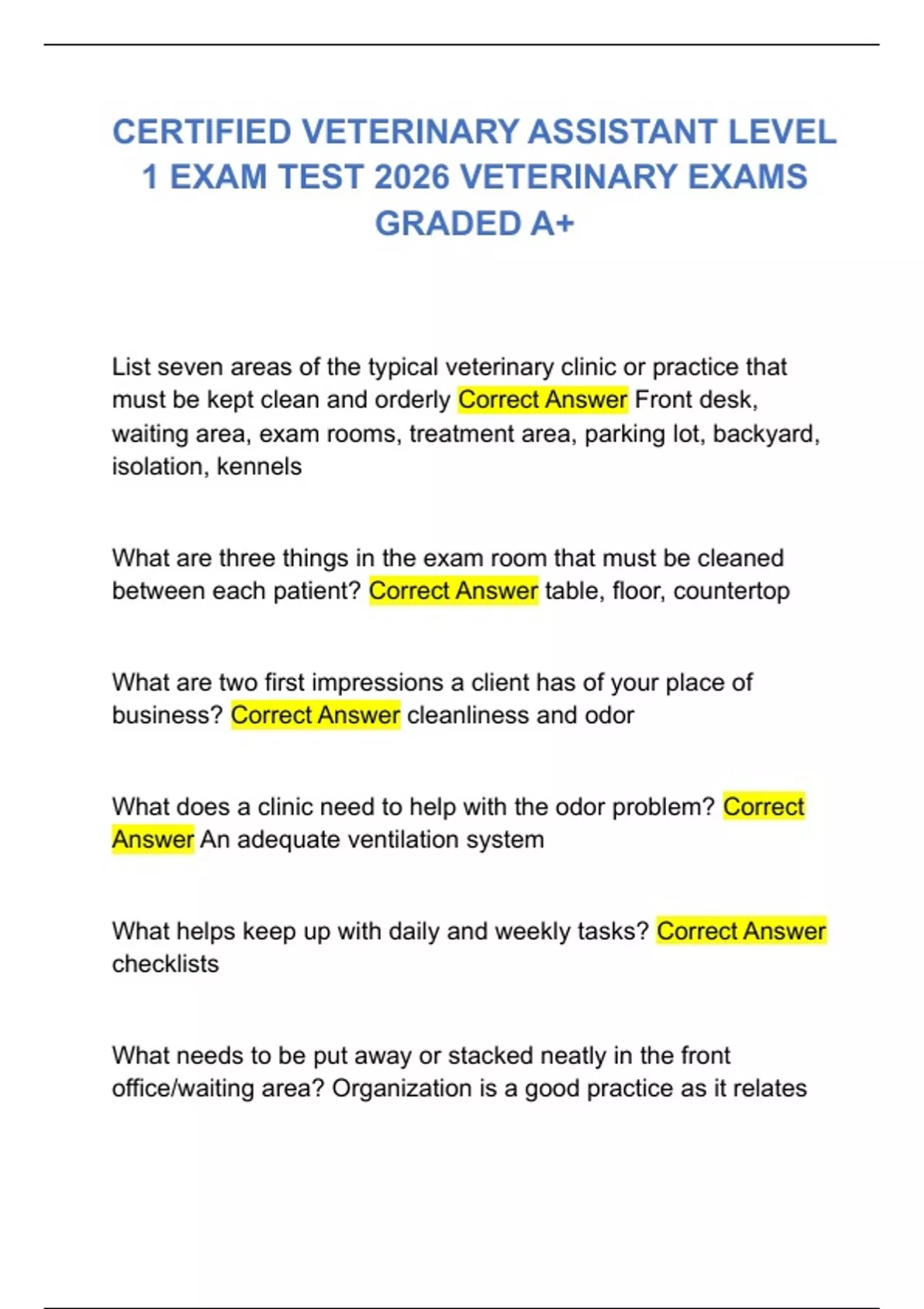 CERTIFIED VETERINARY ASSISTANT LEVEL 1 EXAM TEST 2026 VETERINARY EXAMS GRADED A+