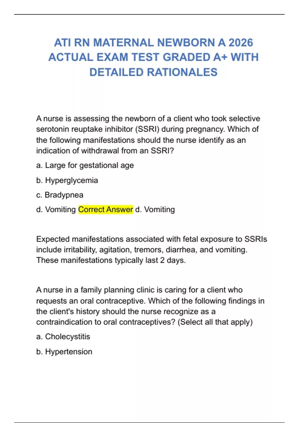 ATI RN MATERNAL NEWBORN A 2026 ACTUAL EXAM TEST GRADED A+ WITH DETAILED RATIONALES