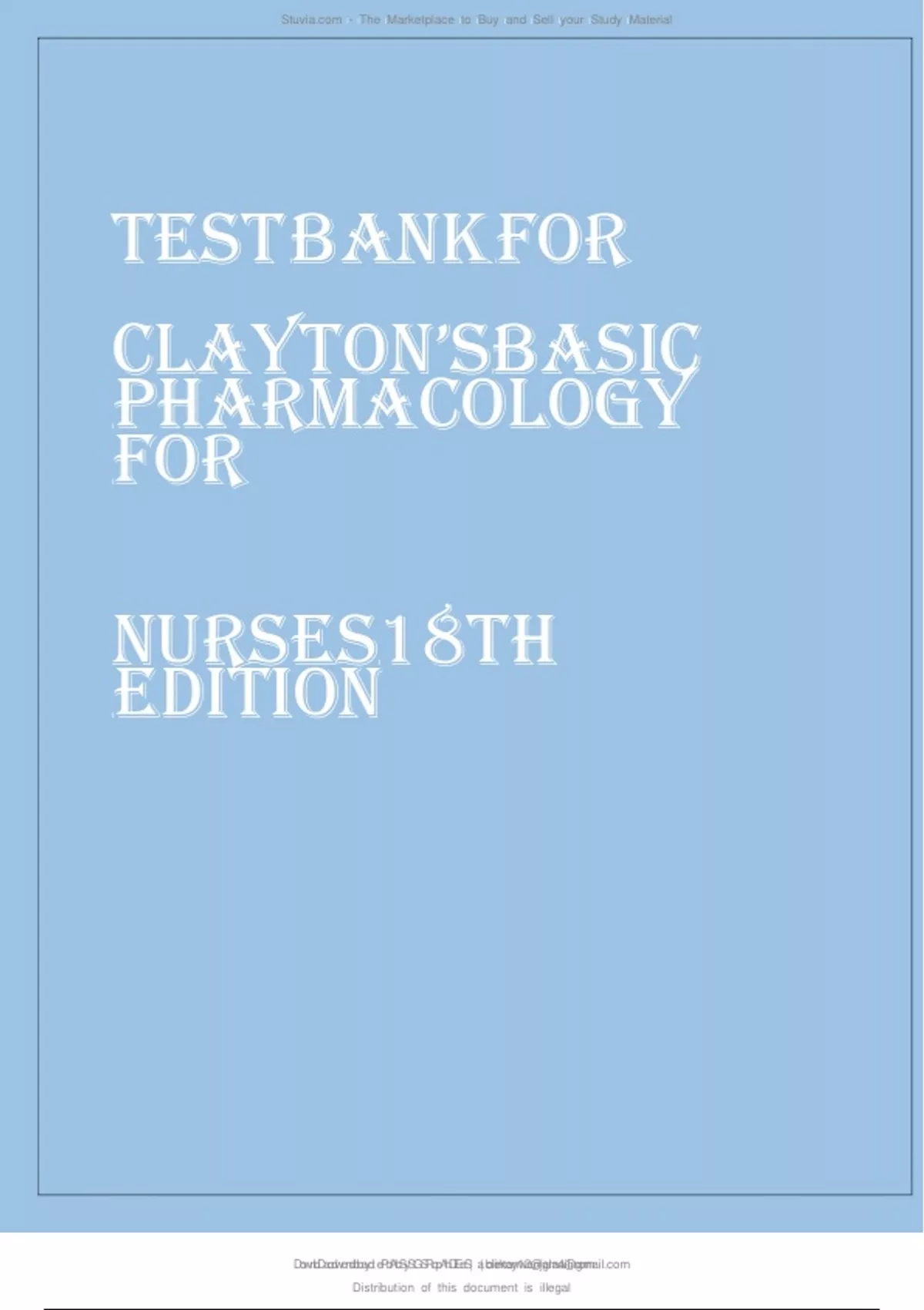 TEST BANK CLAYTON'S BASIC PHARMACOLOGY FOR NURSES 18TH EDITION BY MICHELLE J. WILLIHNGANZ, SAMUEL L. GUREVITZ & BRUCE D. CLAYTON ISBN 9780323550611 ALL CHAPTERS 1-48 COVERED QUESTIONS AND ANSWERS GRADED A+ 100% VERIFIED.