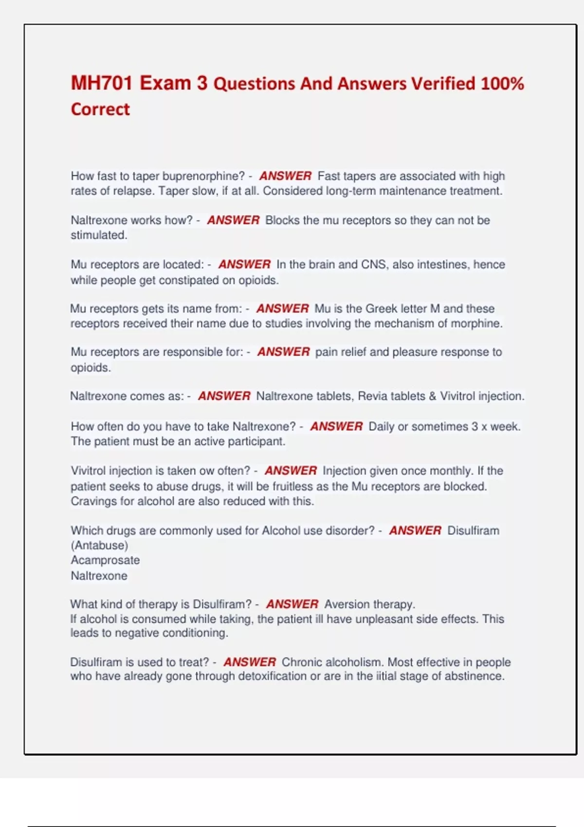 MH701 Exam 3 Questions And Answers Verified 100% Correct How fast to taper buprenorphine? - ANSWER Fast tapers are associated with high rates of relapse. Taper slow, if at all. Considered long-term maintenance treatment. Naltrexone works how? - ANSWER Blocks the mu receptors so they can not be stimulated. Mu receptors are located: - ANSWER In the brain and CNS, also intestines, hence while people get constipated on opioids. Mu receptors gets its name from: - ANSWER Mu is the Greek letter M and these receptors received their name due to studies involving the mechanism of morphine. Mu receptors are responsible for: - ANSWER pain relief and pleasure response to opioids. Naltrexone comes as: - ANSWER Naltrexone tablets, Revia tablets & Vivitrol injection. How often do you have to take Naltrexone? - ANSWER Daily or sometimes 3 x week. The patient must be an active participant. Vivitrol injection is taken ow often? - ANSWER Injection given once monthly. If the patient seeks to abuse drugs, it will be fruitless as the Mu receptors are blocked. Cravings for alcohol are also reduced with this. Which drugs are commonly used for Alcohol use disorder? - ANSWER Disulfiram (Antabuse) Acamprosate Naltrexone What kind of therapy is Disulfiram? - ANSWER Aversion therapy. If alcohol is consumed while taking, the patient ill have unpleasant side effects. This leads to negative conditioning. Disulfiram is used to treat? - ANSWER Chronic alcoholism. Most effective in people who have already gone through detoxification or are in the iitial stage of abstinence. How often to take Disulfiram and how long after alcohol? - ANSWER 1. Once a day tablet form. 2. Should never be taken while intoxicated and should not be taken for at least 12 hours after drinking alcohol. Dangerous side effect of Disulfiram? - ANSWER alcohol toxicity is patient does not abstain from alcohol. Unpleasant side effects of Disulfiram? - ANSWER Nausea, headache, vomiting, chest pains, difficulty breathing. Can occur as soon as 10 minute after drinking even a small amount o alcohol and can last for an hour or more. Acamprosate (Campral) works by: - ANSWER Decreases cravings. Sometimes referred to as artificial alcohol. Good for people who have already stopped drinking and want ot avoid drinking. Use of Acamprosate usually begins when? - ANSWER on 5th day of abstinence and reaches full effectiveness in 5-8 days. How often is Acamprosate taken? - ANSWER 3 times a day. SE of Acamprosate: - ANSWER diarrhea, upset stomach, appetite loss, anxiety, dizziness and difficulty sleeping. Acamprosate is a good choice for those who? - ANSWER have recently abstained from alcohol. No labs needed. What labs would you get before starting Disulfiram? - ANSWER LFT's at baseline and follow up. What labs would you get before stating Naltrexone? - ANSWER LFT's, CBC. CMP, & TSH. Which works quickest Naltrexone or Disulfiram? - ANSWER Disulfiram Naltrexone helps people with: - ANSWER alcohol addiction to reduce their drinking behaviors enough to remain motivated to stay in treatment, avoid relapses and take medications. What other pharmacological interventions are used for AUD? - ANSWER 1. Benzodiazepines for detox. 2. Anticonvulsants for prophylaxis. What med reverses benzodiazepines? - ANSWER Romazicon Why is clonidine used for AUD treatment? - ANSWER control sympathetic nervous system hyperactivity, not effective against seizures and delirium. How do you treat delirium in AUD? - ANSWER Benzodiazepines every 2-4 hours. 50-100 mg chlordiazepoxide every 4 hours if IV lorazepam not possible. . Korsakoff treatment: - ANSWER Same as Wernicke's but for 3-12 months. Name some CNS stimulants: - ANSWER Cocaine, crack, amphetamines', meth, caffeine and nicotine Common signs of stimulant use are: - ANSWER 1. Dilation of pupils. 2. Dryness of oronasal cavity. 3. Excessive motor activity. How fast doe crack work? - ANSWER It takes effect in 4-6 seconds, producing a fleeting high in 5=7 minutes following a period of deep depression that reinforce addictive behavior. Signs of CNS stimulant intoxication: - ANSWER Tachycardia, dilated pupils, elevated BP, N/V, insomnia, grandiosity, impaired judgement, restlessness & convulsions. Club drug: ecstasy is? - ANSWER MDMA, class of substituted amphetamines that also includes Molly or Love. What effects does Ecstasy have? How do people feel? - ANSWER produces subjective feeling that resemble stimulants or hallucinogens. Give outpouring or good feelings about others & world around them. Side effects of Ecstasy are? - ANSWER extremely sensitive, hyperactive, inexhaustible energy, dilated pupils, impaired reaction to light; elevated temp, pulse and BP; diaphoresis, and bruxism. People on Ecstasy need? - ANSWER Lots of water. Or they will have dehydration and hyperthermia.