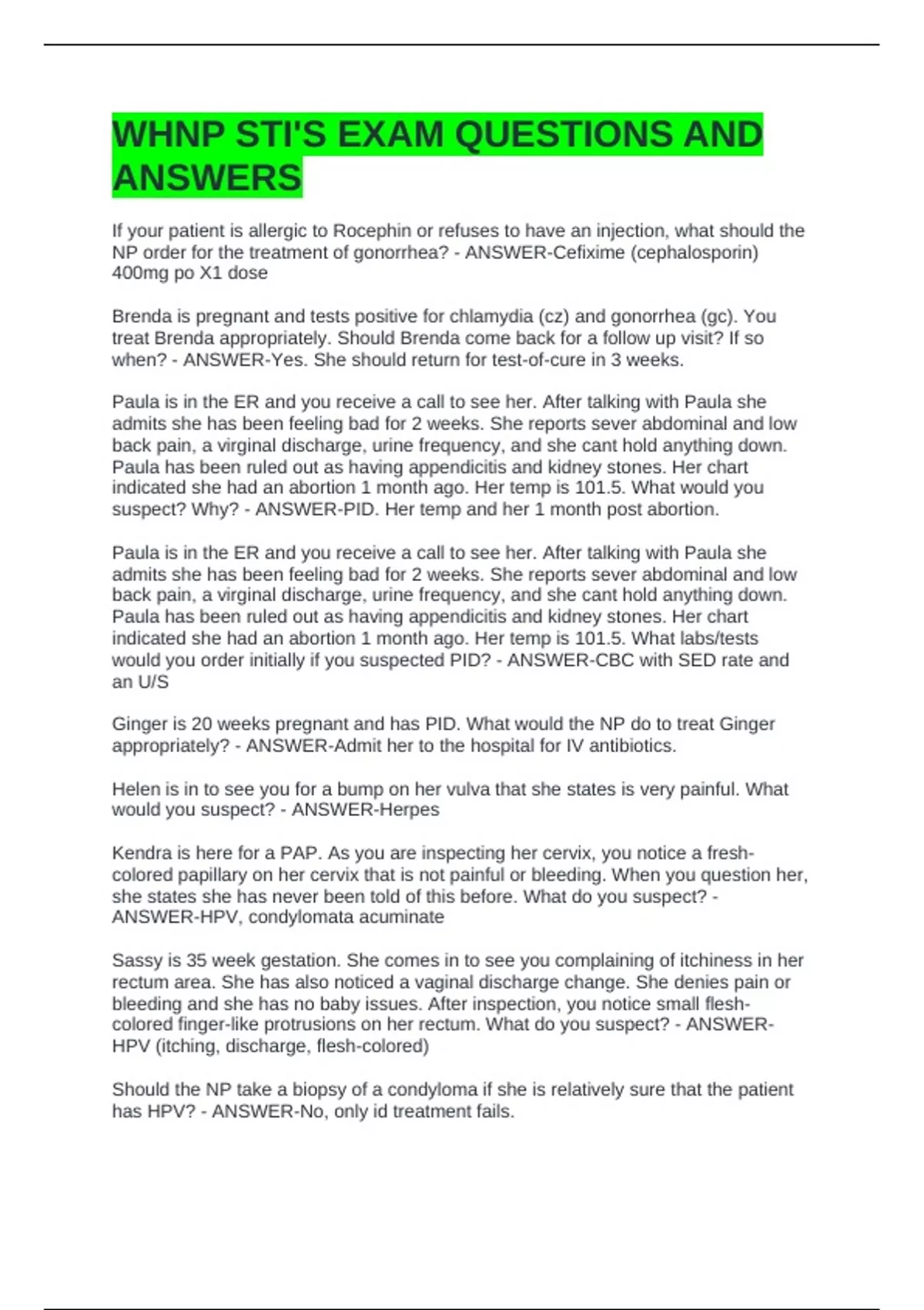 WHNP STI'S EXAM QUESTIONS AND ANSWERS If your patient is allergic to Rocephin or refuses to have an injection, what should the NP order for the treatment of gonorrhea? - ANSWER-Cefixime (cephalosporin) 400mg po X1 dose Brenda is pregnant and tests positive for chlamydia (cz) and gonorrhea (gc). You treat Brenda appropriately. Should Brenda come back for a follow up visit? If so when? - ANSWER-Yes. She should return for test-of-cure in 3 weeks. Paula is in the ER and you receive a call to see her. After talking with Paula she admits she has been feeling bad for 2 weeks. She reports sever abdominal and low back pain, a virginal discharge, urine frequency, and she cant hold anything down. Paula has been ruled out as having appendicitis and kidney stones. Her chart indicated she had an abortion 1 month ago. Her temp is 101.5. What would you suspect? Why? - ANSWER-PID. Her temp and her 1 month post abortion. Paula is in the ER and you receive a call to see her. After talking with Paula she admits she has been feeling bad for 2 weeks. She reports sever abdominal and low back pain, a virginal discharge, urine frequency, and she cant hold anything down. Paula has been ruled out as having appendicitis and kidney stones. Her chart indicated she had an abortion 1 month ago. Her temp is 101.5. What labs/tests would you order initially if you suspected PID? - ANSWER-CBC with SED rate and an U/S Ginger is 20 weeks pregnant and has PID. What would the NP do to treat Ginger appropriately? - ANSWER-Admit her to the hospital for IV antibiotics. Helen is in to see you for a bump on her vulva that she states is very painful. What would you suspect? - ANSWER-Herpes Kendra is here for a PAP. As you are inspecting her cervix, you notice a fresh-colored papillary on her cervix that is not painful or bleeding. When you question her, she states she has never been told of this before. What do you suspect? - ANSWER-HPV, condylomata acuminate Sassy is 35 week gestation. She comes in to see you complaining of itchiness in her rectum area. She has also noticed a vaginal discharge change. She denies pain or bleeding and she has no baby issues. After inspection, you notice small flesh-colored finger-like protrusions on her rectum. What do you suspect? - ANSWER-HPV (itching, discharge, flesh-colored) Should the NP take a biopsy of a condyloma if she is relatively sure that the patient has HPV? - ANSWER-No, only id treatment fails.
