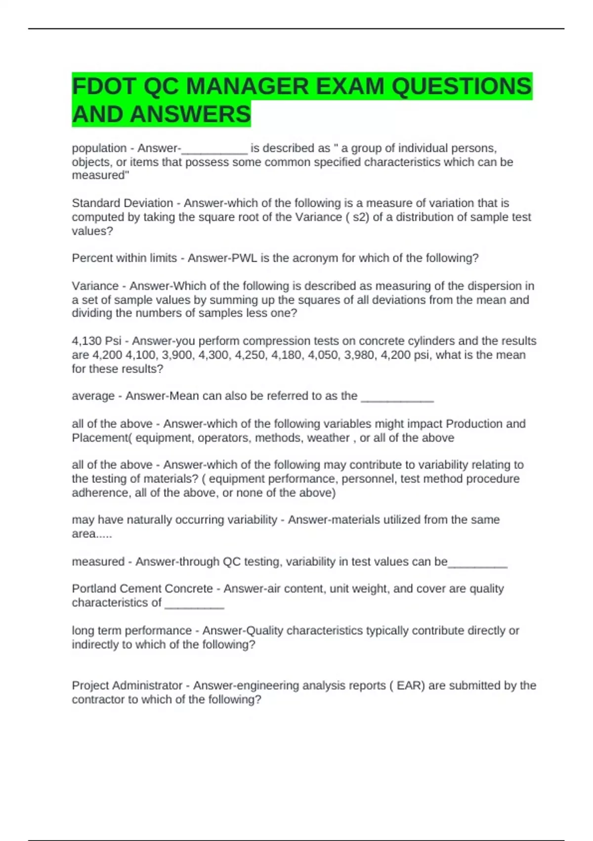 FDOT QC MANAGER EXAM QUESTIONS AND ANSWERS population - Answer-__________ is described as " a group of individual persons, objects, or items that possess some common specified characteristics which can be measured" Standard Deviation - Answer-which of the following is a measure of variation that is computed by taking the square root of the Variance ( s2) of a distribution of sample test values? Percent within limits - Answer-PWL is the acronym for which of the following? Variance - Answer-Which of the following is described as measuring of the dispersion in a set of sample values by summing up the squares of all deviations from the mean and dividing the numbers of samples less one? 4,130 Psi - Answer-you perform compression tests on concrete cylinders and the results are 4,200 4,100, 3,900, 4,300, 4,250, 4,180, 4,050, 3,980, 4,200 psi, what is the mean for these results? average - Answer-Mean can also be referred to as the ___________ all of the above - Answer-which of the following variables might impact Production and Placement( equipment, operators, methods, weather , or all of the above all of the above - Answer-which of the following may contribute to variability relating to the testing of materials? ( equipment performance, personnel, test method procedure adherence, all of the above, or none of the above) may have naturally occurring variability - Answer-materials utilized from the same area..... measured - Answer-through QC testing, variability in test values can be_________ Portland Cement Concrete - Answer-air content, unit weight, and cover are quality characteristics of _________ long term performance - Answer-Quality characteristics typically contribute directly or indirectly to which of the following? Project Administrator - Answer-engineering analysis reports ( EAR) are submitted by the contractor to which of the following?