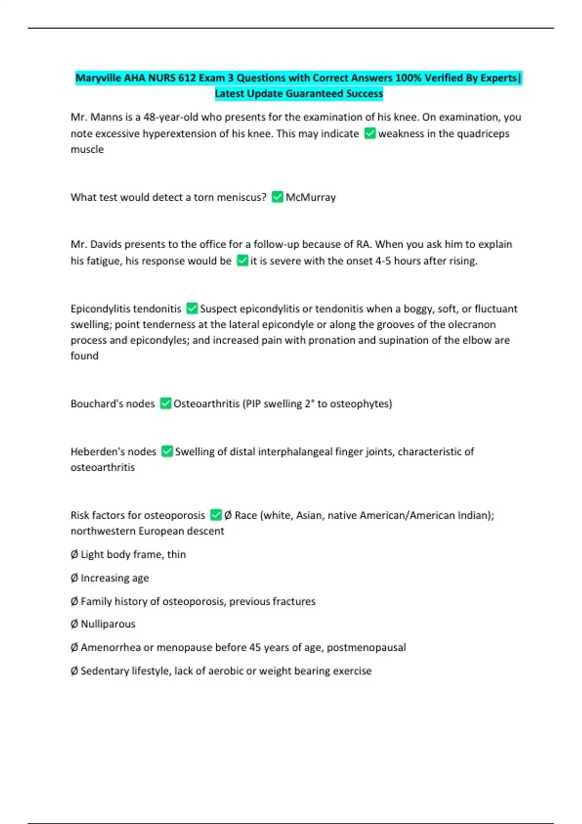 Maryville AHA NURS 612 Exam 3 Questions with Correct Answers 100% Verified By Experts|