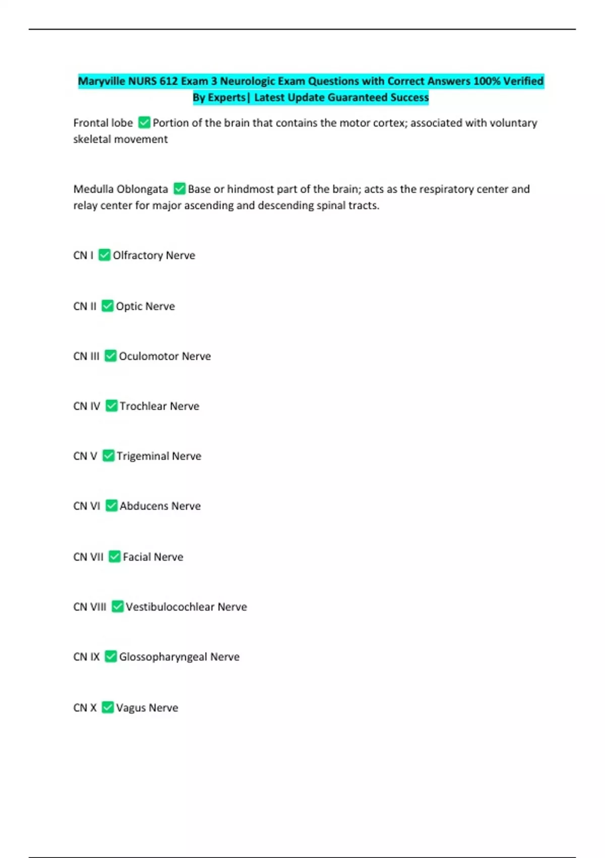 Maryville NURS 612 Exam 3 Neurologic Exam Questions with Correct Answers 100% Verified