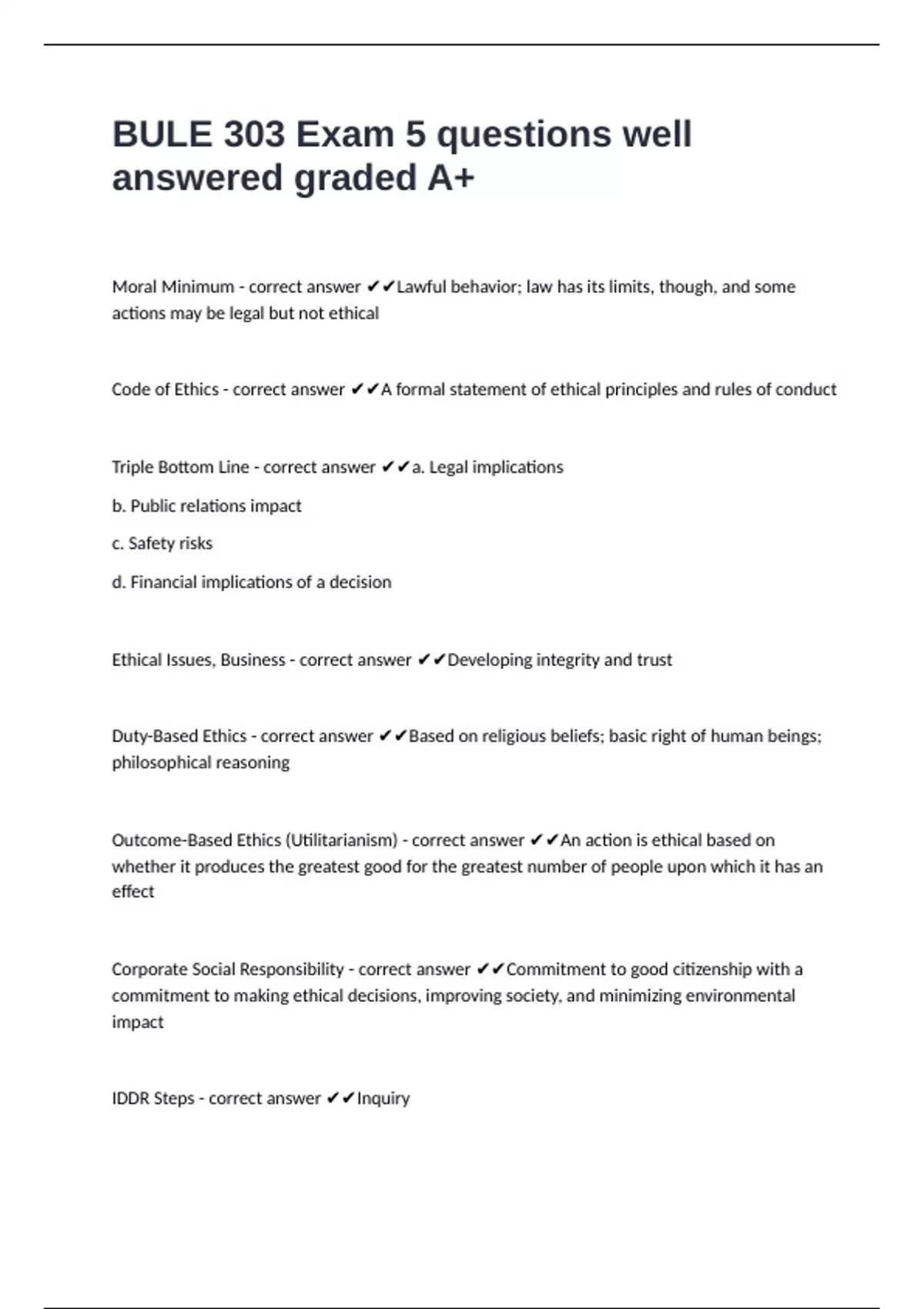 Moral Minimum - correct answer ✔✔Lawful behavior; law has its limits, though, and some