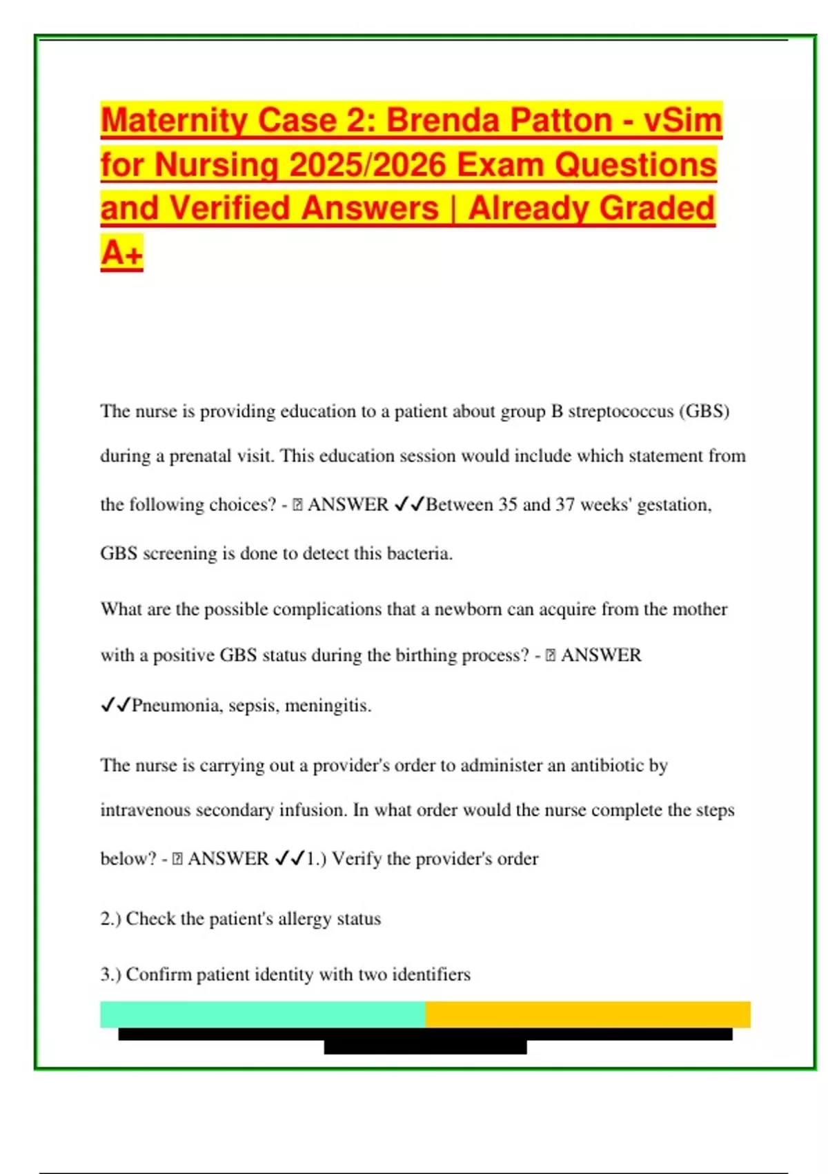 Maternity Case 2: Brenda Patton - vSim for Nursing 2025/2026 Exam Questions and Verified Answers | Already Graded A+