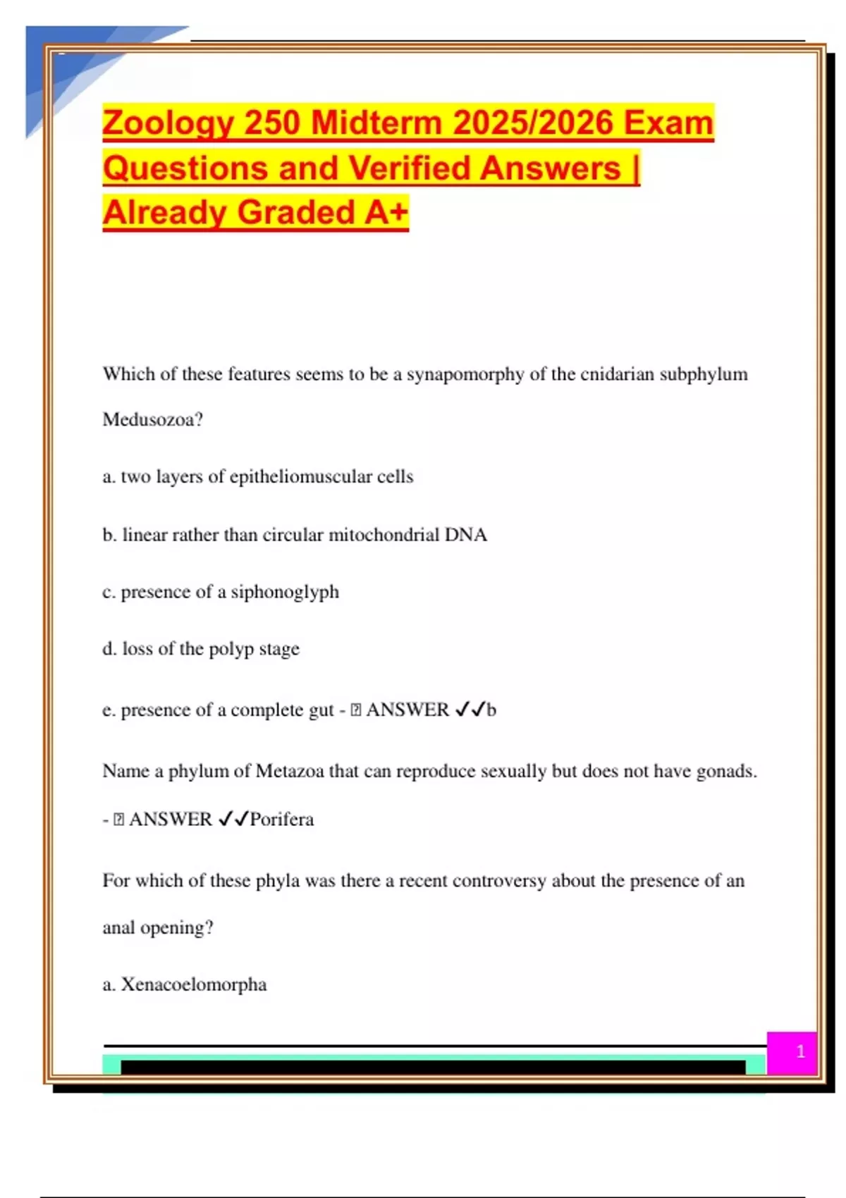 Zoology 250 Midterm 2025/2026 Exam Questions and Verified Answers | Already Graded A+