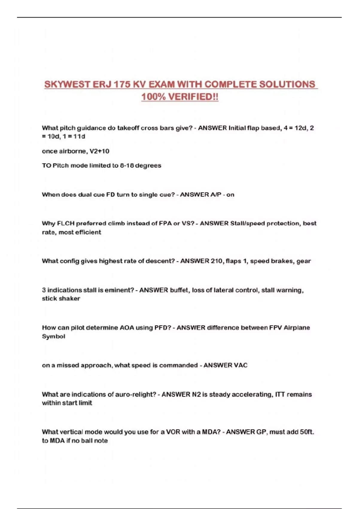 SKYWEST ERJ 175 KV EXAM WITH COMPLETE SOLUTIONS 100% VERIFIED!!...