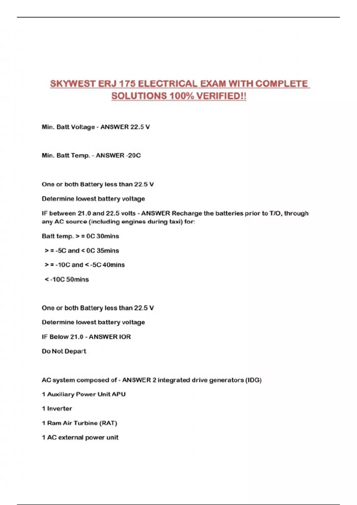 SKYWEST ERJ 175 ELECTRICAL EXAM WITH COMPLETE SOLUTIONS 100% VERIFIED!!...