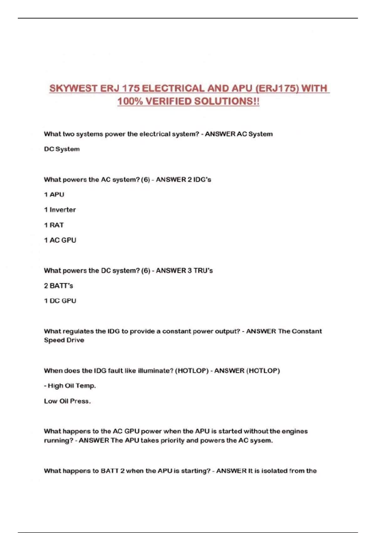 SKYWEST ERJ 175 ELECTRICAL AND APU (ERJ175) WITH 100% VERIFIED SOLUTIONS!!