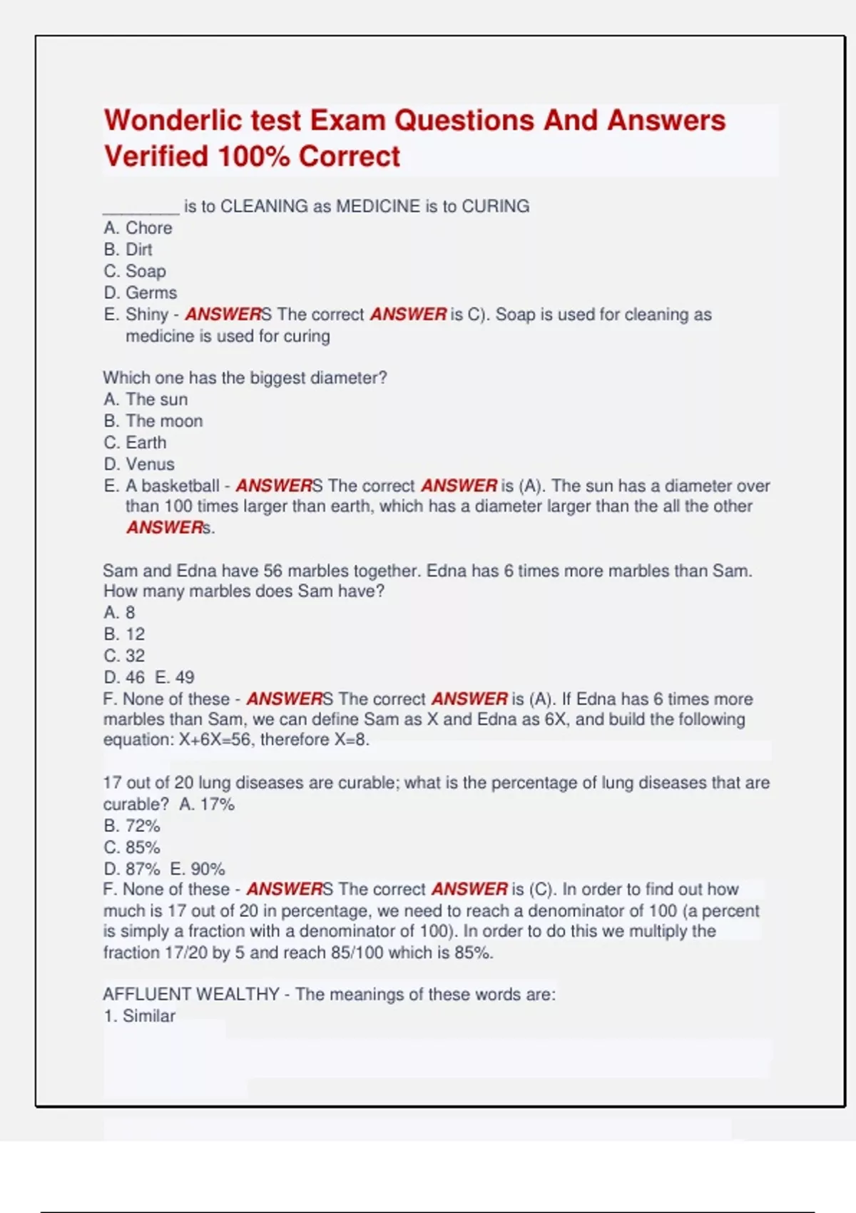 Wonderlic test Exam Questions And Answers Verified 100% Correct ________ is to CLEANING as MEDICINE is to CURING A. Chore B. Dirt C. Soap D. Germs E. Shiny - ANSWERS The correct ANSWER is C). Soap is used for cleaning as medicine is used for curing Which one has the biggest diameter? A. The sun B. The moon C. Earth D. Venus E. A basketball - ANSWERS The correct ANSWER is (A). The sun has a diameter over than 100 times larger than earth, which has a diameter larger than the all the other ANSWERs. Sam and Edna have 56 marbles together. Edna has 6 times more marbles than Sam. How many marbles does Sam have? A. 8 B. 12 C. 32 D. 46 E. 49 F. None of these - ANSWERS The correct ANSWER is (A). If Edna has 6 times more marbles than Sam, we can define Sam as X and Edna as 6X, and build the following equation: X+6X=56, therefore X=8. 17 out of 20 lung diseases are curable; what is the percentage of lung diseases that are curable? A. 17% B. 72% C. 85% D. 87% E. 90% F. None of these - ANSWERS The correct ANSWER is (C). In order to find out how much is 17 out of 20 in percentage, we need to reach a denominator of 100 (a percent is simply a fraction with a denominator of 100). In order to do this we multiply the fraction 17/20 by 5 and reach 85/100 which is 85%. AFFLUENT WEALTHY - The meanings of these words are: 1. Similar 2. Contradictory 3. Neither similar nor contradictory - ANSWERS The correct ANSWER is (A). Both affluent and wealthy mean having a great deal of resources or money. Therefore, the words are similar in meaning. If the first two statements are true, is the final statement true? Fair haired dogs live longer than black haired ones. Rocco is a fair haired dog. Rocco will live longer than Bonzo. A. Yes B. No C. Uncertain - ANSWERS The correct ANSWER is (C). Because we do not know what kind of hair Bonzo has, we cannot know anything about his life span compared to Rocco. Therefore, the statement is uncertain. START is the opposite of... A. Source B. Inception C. Conclusion D. Initiation E. Origin - ANSWERS The correct ANSWER is (C). Start means "to begin," so the antonym is conclusion. Inception and origin are synonyms. Source is not related. Therefore, the correct ANSWER is conclusion. IMPERIOUS is the opposite of... A. Arrogant B. Moody C. Subservient D. Quiet E. Stormy - ANSWERS The correct ANSWER is (C). The word imperious describes an arrogantly domineering or overbearing person while a subservient person is extremely compliant and submissive. How many of the six pairs listed below are exact duplicates? A. 1 B. 2 C. 3 D. 4 E. 5 - ANSWERS The correct ANSWER is (D). The exact duplicates are: 3356; 7776145; 865656; 71829 In the following set of words, which word is different from the others? A. Solemn B. Archaic C. Grave D. Mirthless E. Serious - ANSWERS The correct ANSWER is (B). Archaic is a word used to describe something that belongs to an earlier period of time, while the other words are used to describe sad and gloomy states of mind or facial expressions. How many of the five pairs listed below are exact duplicates? 123A3 122A3 LLO8761 LLO8761 KKA3213 KKA3233 ORR13726B ORR13726B 12AB12AB1 12AB1AB121 A. 1 B. 2 C. 3 D. 4 E. 5 - ANSWERS The correct ANSWER is (B). The exact duplicates are: LLO8761, ORR13726B If the first two statements are true, is the final statement true? All dogs have a brown leg. Barky has a brown leg. Barky is a dog. A. True B. False C. Uncertain - ANSWERS The correct ANSWER is (C). The fact that every dog has a brown leg doesn't mean that each creature with brown leg is a dog. John's monthly salary is $7,000. If John deposits 0.75 of his paycheck into a savings account. How much money does he put in his savings account every month? A. $4,240 B. $4,250 C. $5,250 D. $ 6,250 - ANSWERS The correct ANSWER is (C). In order to find how much money he puts in his savings account, we need to find how much is 0.75 of $7,000: