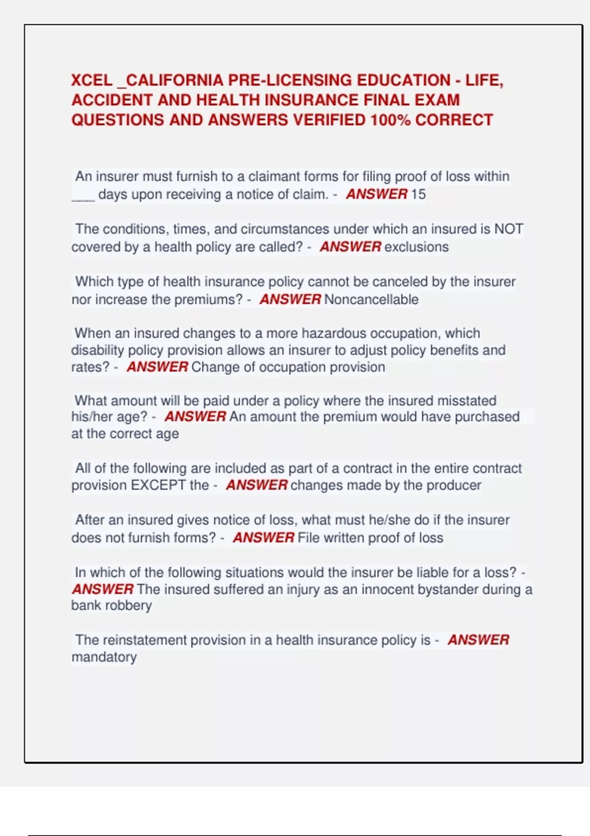 XCEL _CALIFORNIA PRE-LICENSING EDUCATION - LIFE, ACCIDENT AND HEALTH INSURANCE FINAL EXAM QUESTIONS AND ANSWERS VERIFIED 100% CORRECT An insurer must furnish to a claimant forms for filing proof of loss within ___ days upon receiving a notice of claim. - ANSWER 15 The conditions, times, and circumstances under which an insured is NOT covered by a health policy are called? - ANSWER exclusions Which type of health insurance policy cannot be canceled by the insurer nor increase the premiums? - ANSWER Noncancellable When an insured changes to a more hazardous occupation, which disability policy provision allows an insurer to adjust policy benefits and rates? - ANSWER Change of occupation provision What amount will be paid under a policy where the insured misstated his/her age? - ANSWER An amount the premium would have purchased at the correct age All of the following are included as part of a contract in the entire contract provision EXCEPT the - ANSWER changes made by the producer After an insured gives notice of loss, what must he/she do if the insurer does not furnish forms? - ANSWER File written proof of loss In which of the following situations would the insurer be liable for a loss? - ANSWER The insured suffered an injury as an innocent bystander during a bank robbery The reinstatement provision in a health insurance policy is - ANSWER mandatory A health insurance policy that allows an insurer to change the policyowner's premiums, but NOT cancel the policy is called a(n) - ANSWER guaranteed renewable policy Written notice for a health claim must be given to the insurer ___ days after the occurrence of the loss. - ANSWER 20 Kathy pays a monthly premium on her health insurance policy. How long is her grace period? - ANSWER 10 days The insurer has the option of terminating a health insurance policy on a date stated in the contract. What type of policy is this? - ANSWER Optionally renewable Under a noncancellable health insurance policy, an insurer can - ANSWER cancel the policy for nonpayment of premium Which of the following is NOT a required provision in an accident and health insurance policy? - ANSWER change of occupation What type of changes can be made to a guaranteed renewable health insurance policy? - ANSWER The premium rates of the policyowner Under a health insurance policy, the provision that states the kind of benefits provided and the circumstances under which they will be paid is called the? - ANSWER insuring clause The legal action provision in a health contract is limited to no more than ___ years. - ANSWER 5 In what situation does a waiver of premium provision keep a health insurance policy in force without premium payments? - ANSWER When an insured becomes totally disabled A health insurance policy paid on a quarterly basis has a grace period of - ANSWER 31 days Bruce is involved in an accident and becomes totally and permanently disabled. His insurance policy continues in force without payment of further premiums. Which policy provision is responsible for this? - ANSWER Waiver of premium provision The entire contract includes the actual policy and the - ANSWER application In contrast to a guaranteed renewable policy, a noncancellable policy - ANSWER may never raise premiums The type of policy where the insurer can send a notice to the insured that the policy has been cancelled in the middle of the term is called - ANSWER cancelable Disability Income plans which require that the insurer can NEVER change or alter premium rates are usually considered - ANSWER Noncancellable Which of the following actions may an insurance company NOT do in a health policy that contains a guaranteed renewable premium benefit? - ANSWER Increase the premiums on an individual basis This MANDATORY health policy provision states that the policy, including endorsements and attached papers, constitutes - ANSWER the entire insurance contract between the parties In group health care, what is the purpose of the coordination of benefits provision? - ANSWER Determines what is paid by the primary and secondary insurers in the event of a claim The time limit for filing claim disputes is addressed in which provision of an accident and health policy? - ANSWER Legal actions Richard owns an insurance policy that is renewable only at the option of the insurance company. His policy is considered to be - ANSWER optionally renewable