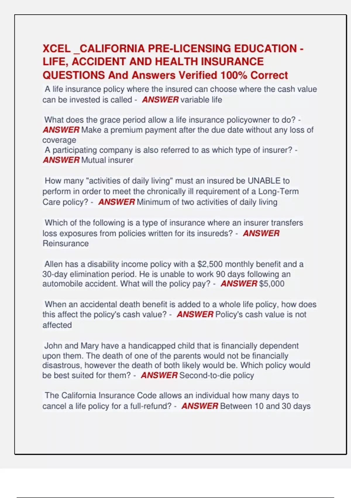 XCEL _CALIFORNIA PRE-LICENSING EDUCATION - LIFE, ACCIDENT AND HEALTH INSURANCE QUESTIONS And Answers Verified 100% Correct A life insurance policy where the insured can choose where the cash value can be invested is called - ANSWER variable life What does the grace period allow a life insurance policyowner to do? - ANSWER Make a premium payment after the due date without any loss of coverage A participating company is also referred to as which type of insurer? - ANSWER Mutual insurer How many "activities of daily living" must an insured be UNABLE to perform in order to meet the chronically ill requirement of a Long-Term Care policy? - ANSWER Minimum of two activities of daily living Which of the following is a type of insurance where an insurer transfers loss exposures from policies written for its insureds? - ANSWER Reinsurance Allen has a disability income policy with a $2,500 monthly benefit and a 30-day elimination period. He is unable to work 90 days following an automobile accident. What will the policy pay? - ANSWER $5,000 When an accidental death benefit is added to a whole life policy, how does this affect the policy's cash value? - ANSWER Policy's cash value is not affected John and Mary have a handicapped child that is financially dependent upon them. The death of one of the parents would not be financially disastrous, however the death of both likely would be. Which policy would be best suited for them? - ANSWER Second-to-die policy The California Insurance Code allows an individual how many days to cancel a life policy for a full-refund? - ANSWER Between 10 and 30 days How long must life agents keep their transaction records? - ANSWER 5 years Restoring an insured to the same condition as before a loss is known as - ANSWER Principle of indemnity In what order are people on the MRMIP waiting list allowed to enroll? - ANSWER Based on the date an individual's application is received What is the purpose of the Pre-Existing Condition Insurance Plan (PCIP)? - ANSWER PCIP was created by the PPACA for people rejected by private health insurers due to pre-existing conditions The conditions, times, and circumstances under which an insured is NOT covered by a health policy are called - ANSWER exclusions Which of the following is NOT a feature of equity-indexed annuities? - ANSWER Offers a maximum interest rate that increases annually Mark, age 45, has a Modified Endowment Contract (MEC). What is the tax penalty for taking a loan against this policy prior to age 59 1/2? - ANSWER 10% What is required after a life agent sells an insurance policy to an applicant without being appointed by the insurer? - ANSWER Notice of appointment must be submitted to the Commissioner Premiums are best described as - ANSWER money paid by the insured to acquire a policy's benefits Life insurance surplus must be distributed to policyowners at what frequency? - ANSWER Annually Which of the following types of information is NOT required for a life insurance application? - ANSWER Ethnicity According to the California Insurance Code, how is the word "may" interpreted? - ANSWER Permissive An annuity which is backed by a life insurer's separate account is called a(n) - ANSWER variable annuity According to PPACA, what is a health benefits exchange? - ANSWER An entity to which individuals and small businesses can have access to affordable health coverage What area of group health insurance is regulated under the Employee Retirement Security Act of 1974 (ERISA)? - ANSWER Disclosure and reporting When does a life insurance policy's waiver of premium take effect? - ANSWER Insured becomes totally disabled Which of the following types of life insurance combines a savings element along with a flexible premium option? - ANSWER Universal life Which entity has jurisdiction over health care coverage providers? - ANSWER Department of Insurance Which of the following is NOT a true description of non-medical life insurance? - ANSWER Applicants are not required to ANSWER medical questions on the application Which of the following is NOT a common life insurance policy rider? - ANSWER extended term MRMIP is a - ANSWER state program that offers health coverage to California residents who are not able to obtain coverage due to pre existing conditions Which of the following types of life insurance is normally associated with a