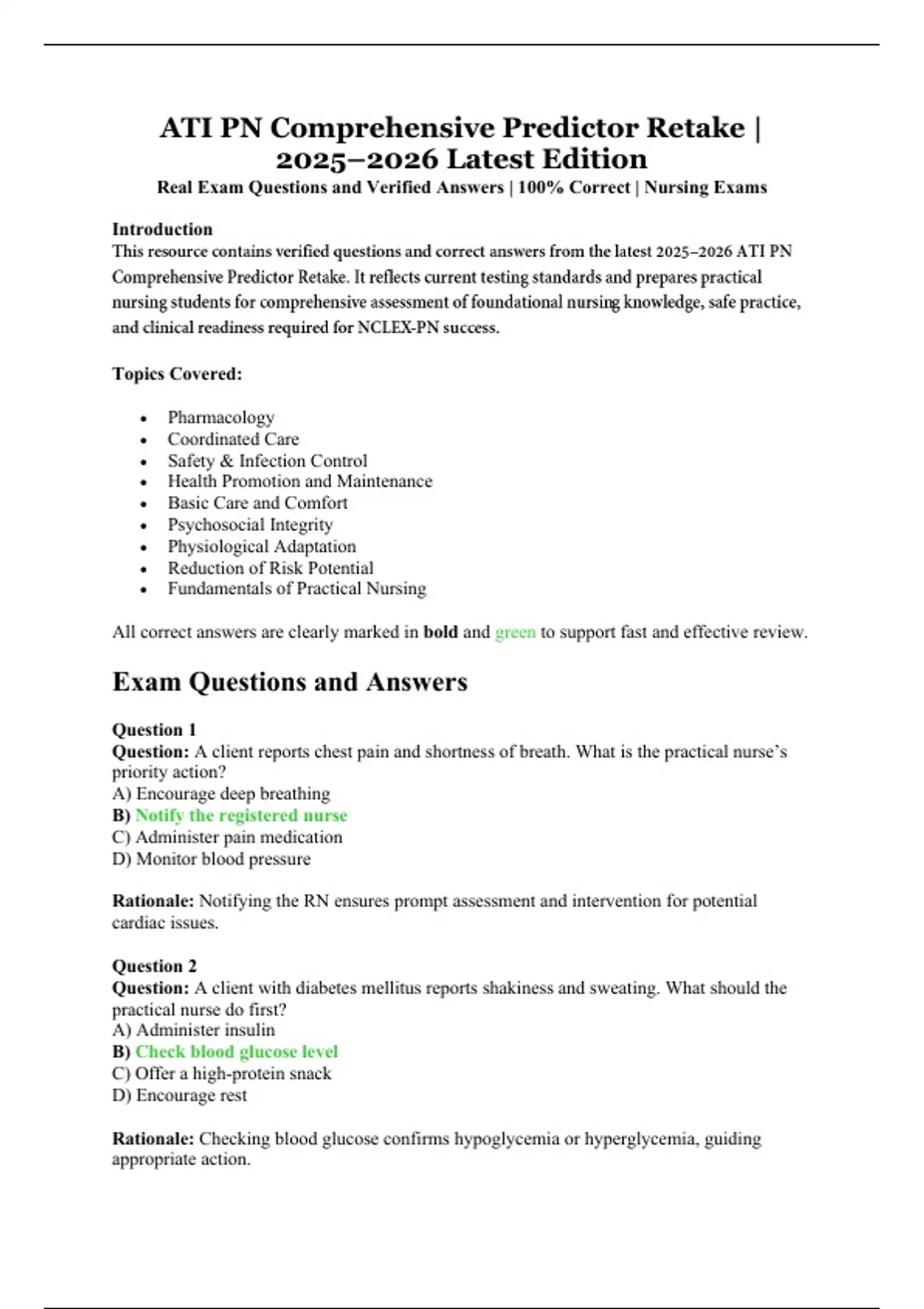This document provides the ATI PN Comprehensive Predictor Retake Exam for the 2025–2026 edition, featuring real exam questions with 100% verified correct answers. It covers core practical nursing topics including pharmacology, fundamentals, maternal newborn, mental health, and nursing care of children. Ideal for PN students preparing for the ATI retake with accurate, high-quality content designed to boost predictor scores.