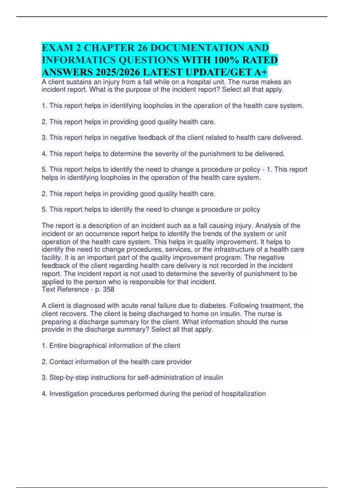 EXAM 2 CHAPTER 26 DOCUMENTATION AND INFORMATICS QUESTIONS WITH 100% RATED ANSWERS 2025/2026 LATEST UPDATE/GET A+