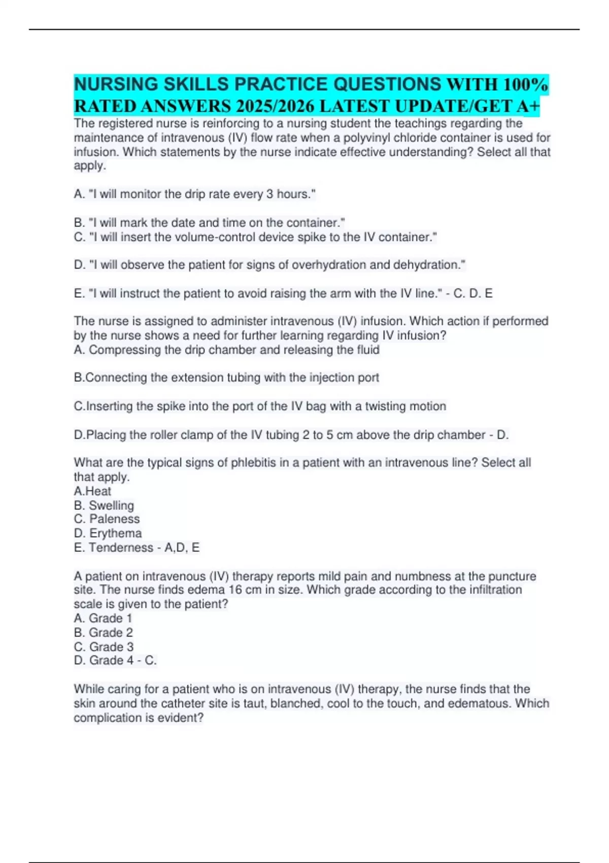 NURSING SKILLS PRACTICE QUESTIONS WITH 100% RATED ANSWERS 2025/2026 LATEST UPDATE/GET A+