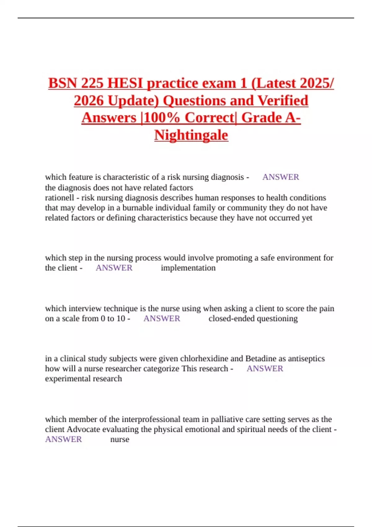BSN 225 HESI practice exam 1 (Latest 2025/ 2026 Update) Questions and Verified Answers |100% Correct| Grade A- Nightingale