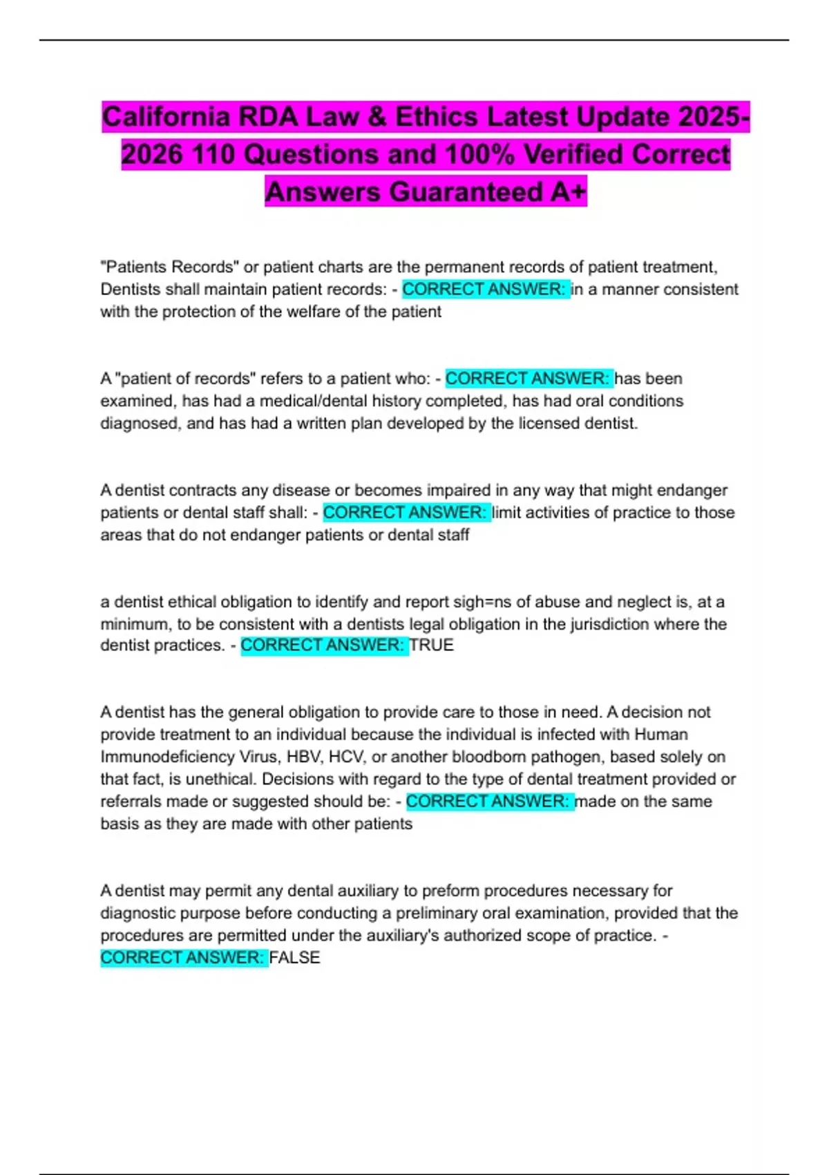 California RDA Law & Ethics Latest Update Questions and 100% Verified Correct Answers Guaranteed A+
