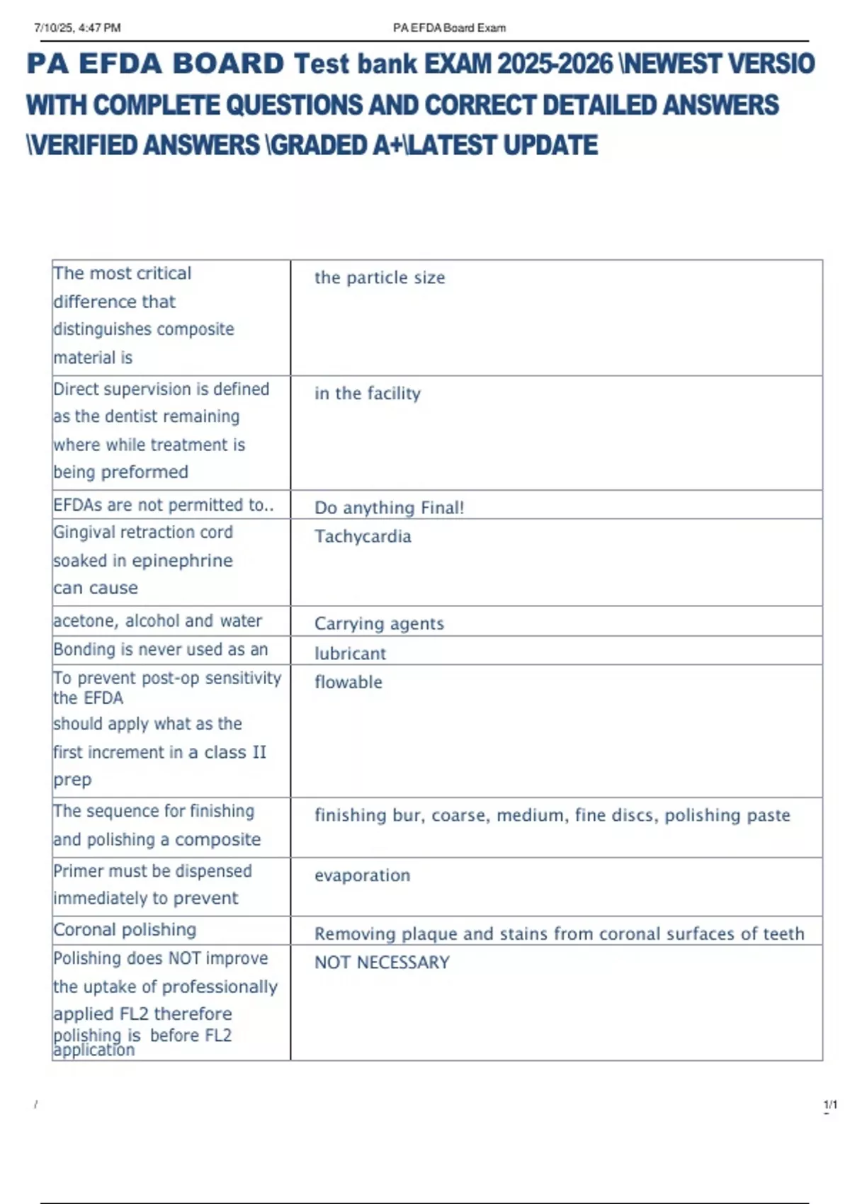 PA EFDA BOARD Test bank EXAM 2025-2026 \NEWEST VERSIO