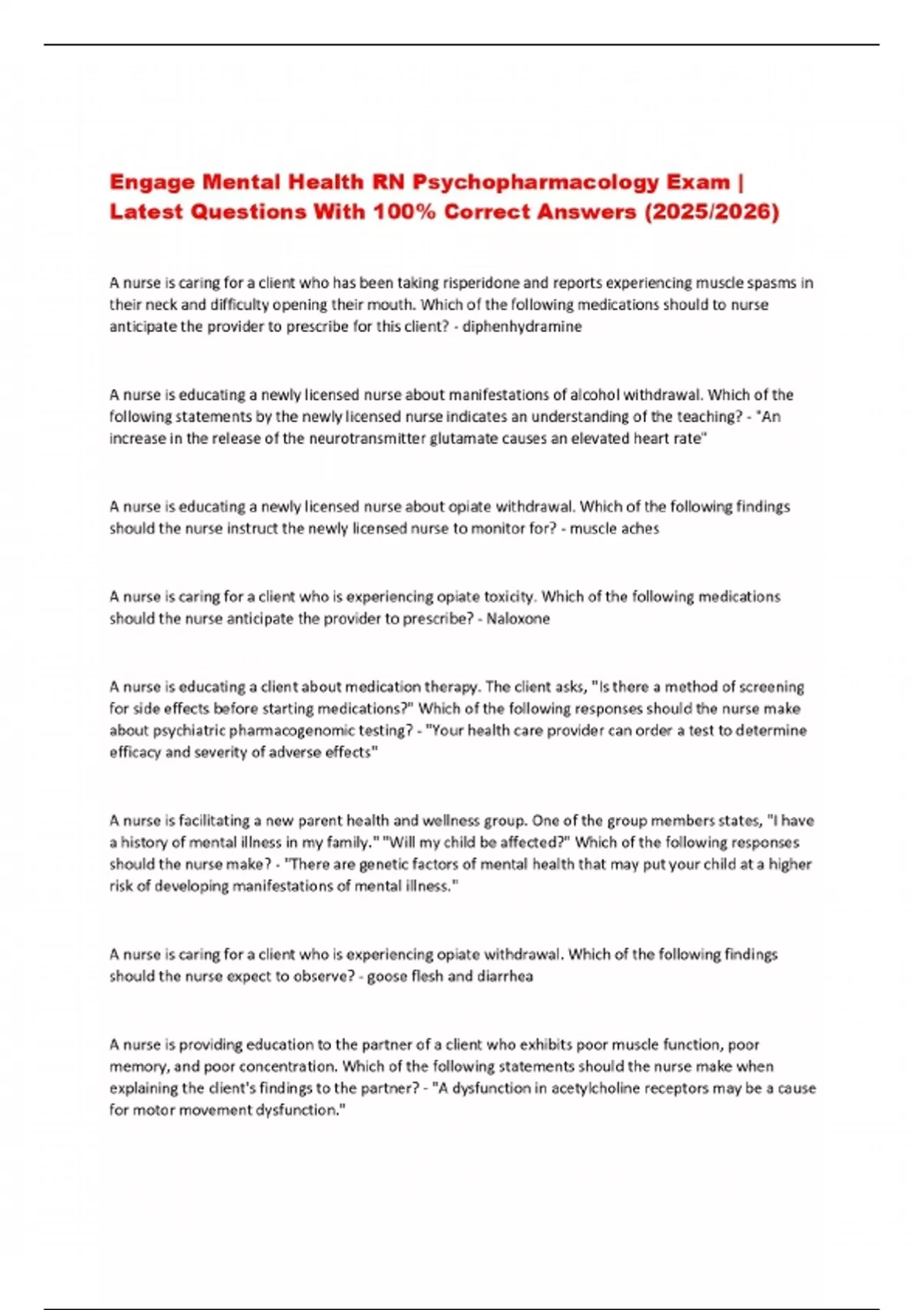 Engage Mental Health RN Psychopharmacology Exam | Latest Questions With 100% Correct Answers (2025/2026)