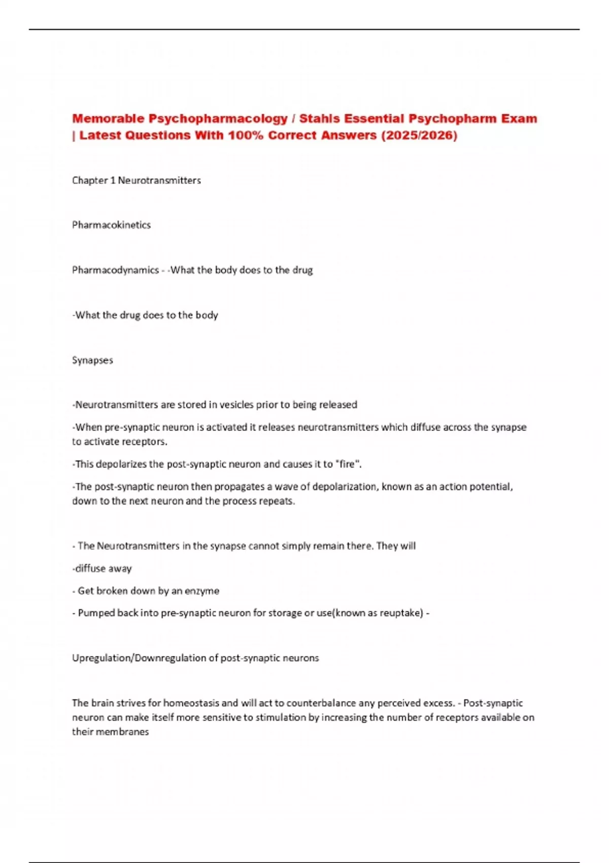 Memorable Psychopharmacology / Stahls Essential Psychopharm Exam | Latest Questions With 100% Correct Answers (2025/2026)