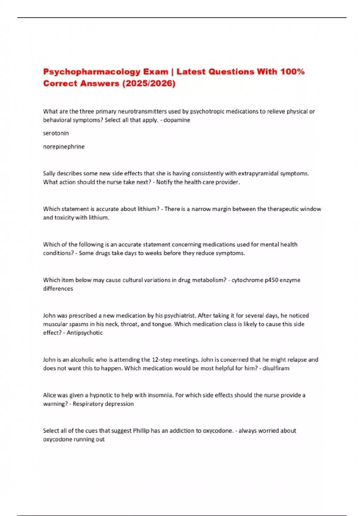 Psychopharmacology Exam | Latest Questions With 100% Correct Answers (2025/2026)