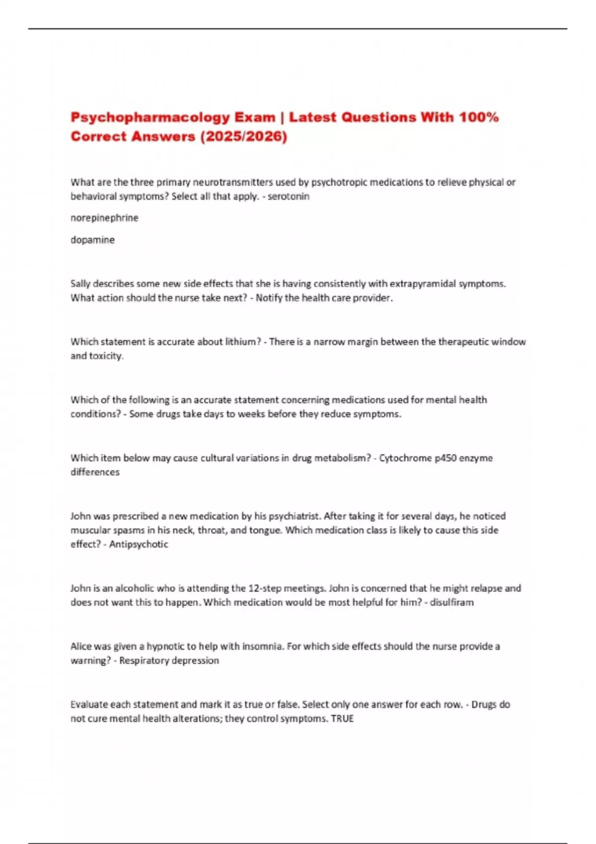 Psychopharmacology Exam | Latest Questions With 100% Correct Answers (2025/2026)