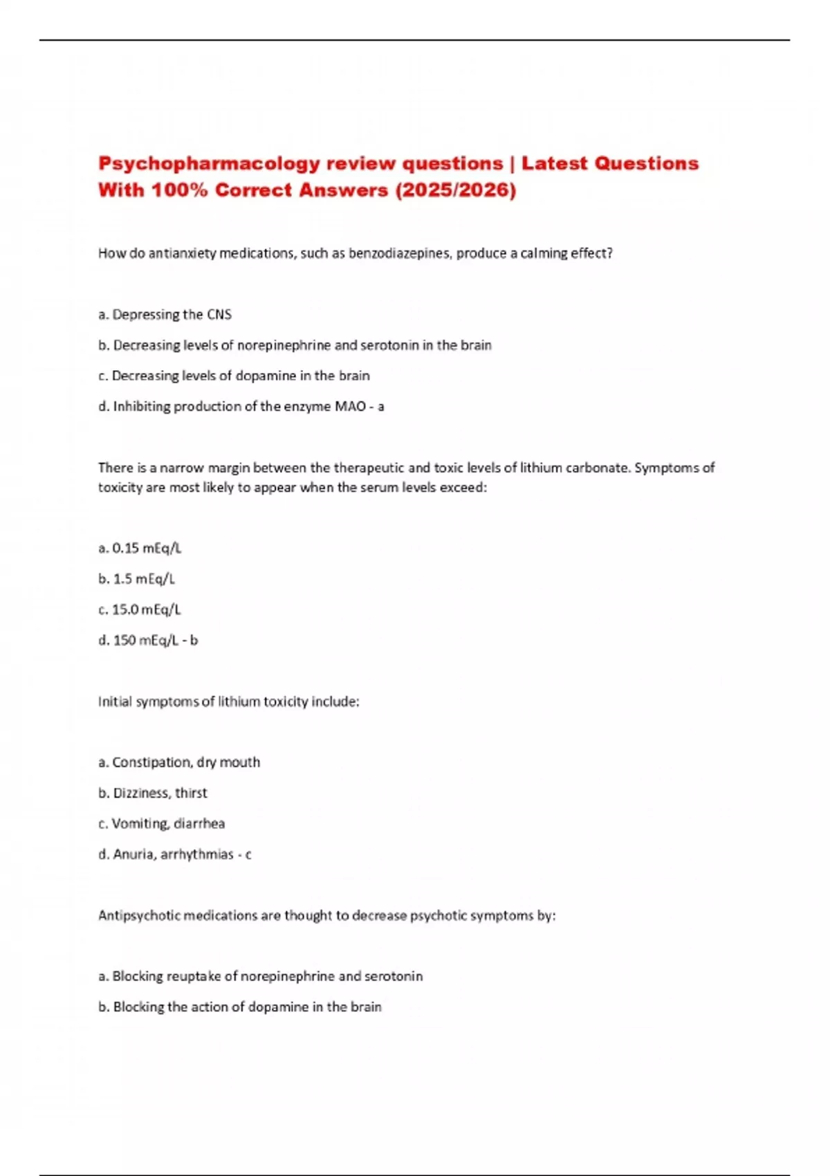Psychopharmacology review questions | Latest Questions With 100% Correct Answers (2025/2026)