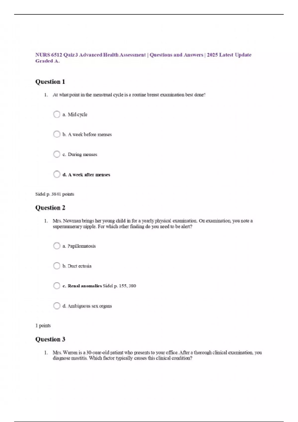 NURS 6512 Quiz 3 Advanced Health Assessment | Questions and Answers | 2025 Latest Update Graded A.