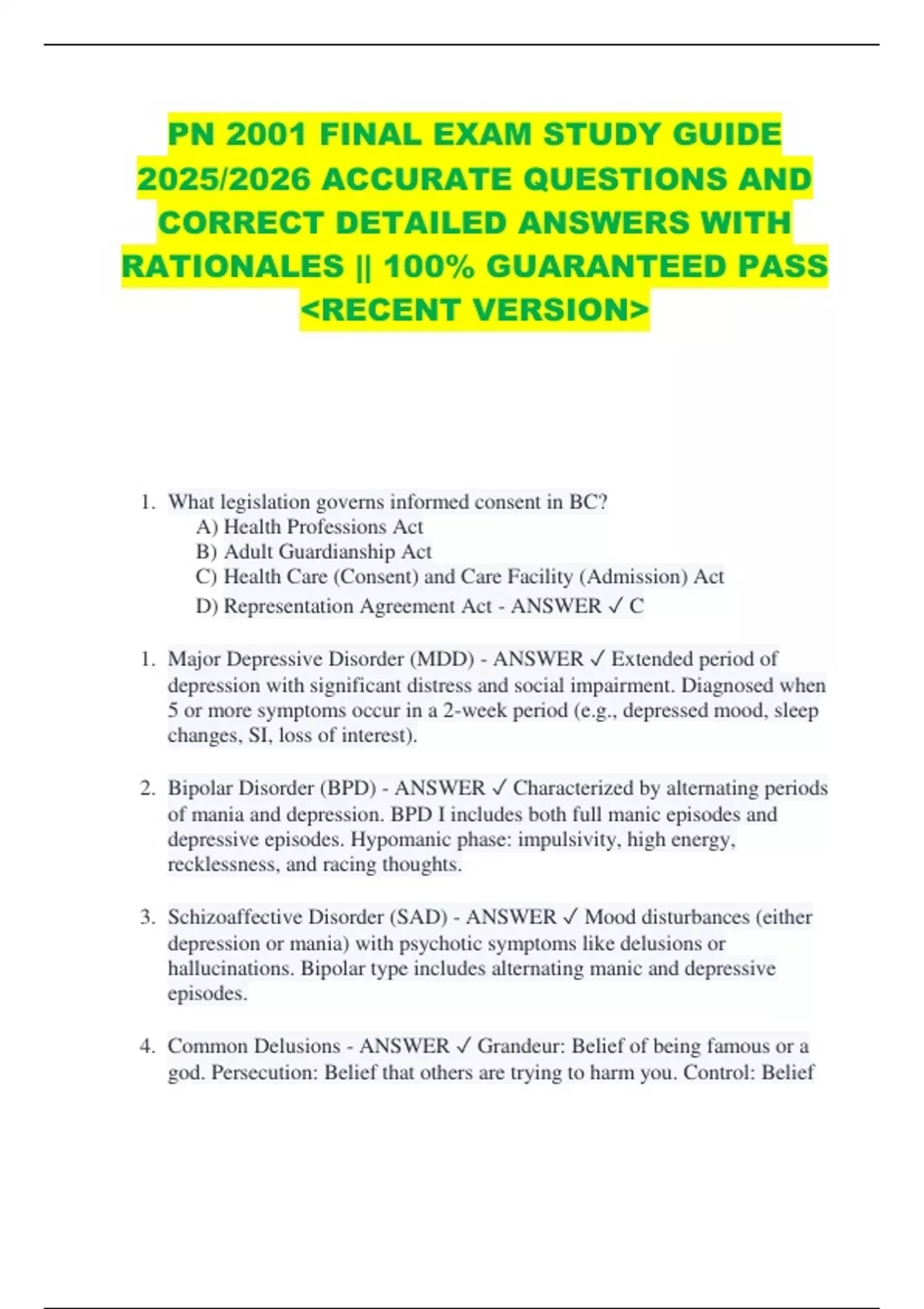 PN 2001 FINAL EXAM STUDY GUIDE 2025/2026 ACCURATE QUESTIONS AND CORRECT DETAILED ANSWERS WITH RATIONALES || 100% GUARANTEED PASS &lt;RECENT VERSION&gt; 1. What legislation governs informed consent in BC? A) Health Professions Act B) Adult Guardianship Act C) Health Care (Consent) and Care Facility (Admission) Act D) Representation Agreement Act - ANSWER C 1. Major Depressive Disorder (MDD) - ANSWER Extended period of depression with significant distress and social impairment. Diagnosed when 5 or more symptoms occur in a 2-week period (e.g., depressed mood, sleep changes, SI, loss of interest). 2. Bipolar Disorder (BPD) - ANSWER Characterized by alternating periods of mania and depression. BPD I includes both full manic episodes and depressive episodes. Hypomanic phase: impulsivity, high energy, recklessness, and racing thoughts. 3. Schizoaffective Disorder (SAD) - ANSWER Mood disturbances (either depression or mania) with psychotic symptoms like delusions or hallucinations. Bipolar type includes alternating manic and depressive episodes. 4. Common Delusions - ANSWER Grandeur: Belief of being famous or a god. Persecution: Belief that others are trying to harm you. Control: Belief that your thoughts are controlled by others. Reference: Belief that messages from the TV or media are directed personally at you. 5. Neurotoxicity in Depression - ANSWER Chronic stress and negative life events can lead to brain atrophy, particularly in the hippocampus, due to prolonged cortisol release. 6. Integrating Theories of Depression - ANSWER Stressor → Dysfunctional cognition (e.g., negative schema, learned helplessness) → Genetic vulnerability (cortisol release) → Mood changes → Withdrawal → Lack of positive social experiences. 7. Drug Therapy for Depression - ANSWER SSRIs and Tricyclics increase neurotransmitter levels. SSRIs can trigger neurogenesis in the hippocampus, potentially reversing atrophic brain changes. 8. Electroconvulsive Therapy (ECT) - ANSWER ECT is used for severe, treatment-resistant depression. It stimulates neurogenesis in the hippocampus and is highly effective (60-70% success rate). 9. Behavior Activation Therapy - ANSWER Daily monitoring of pleasant vs. unpleasant events. Focuses on increasing client access to positive reinforcers and improving social skills through role play and positive reinforcement. 10. What does science aim for - ANSWER originality, detachment, universality, skepticism, critical thinking, progressiveness 11. What does science do - ANSWER increases knowledge 12. Pure science - ANSWER a world exists independently of us, science aims to provide knowledge about the world 13. Applied science - ANSWER problems in the world, science aims to provide at least practical recommendations if not solutions 14. Ontology - ANSWER The study of reality in the sense of being or existence. Positivism: Single objective reality independent of observer Relativism: Multiple realities which are subjective 15. Epistemology - ANSWER The study of what knowledge is and how to increase it. Acquisitional knowledge- familiarity with individuals and situations. Procedural knowledge- how to ride a bike Propositional knowledge- facts 16. What is knowledge - ANSWER A false proposition cannot be known, must have a good justified reason to believe. 17. Poor sources of justification - ANSWER Perceptual experience, introspection, memory and testimony 18. The Gettier Problem - ANSWER Justification not justified 19. A priori justification - ANSWER Associated with rationalism. If the justification can be deduced without depending on new observations or experiences 20. A posteriori justification - ANSWER Associated with empiricism. Occurs when the justification requires new observations. But Hume pointed out we cannot prove statements using observation 21. Popper - ANSWER test to see if the evidence is reliable. justificationism does not require this, just that the reasons for th justification are sound 22. Rationalism - ANSWER real knowledge is only possible if it is based on something that is certain. Cannot be based on experience 23. Skepticism - ANSWER we know nothing. 24. Empiricism - ANSWER knowledge coms from experience as well as reason 25. Central Tendency - ANSWER The mean is a measure of central tendency. It is a single score that represents the data. 26. Dispersion spread - ANSWER Standard deviation is a measure of the variability in the data . The square root of the variance 27. Z-scores - ANSWER We can compare a range of measurements using z (standard score). We can express how many SD units away from the mean a point in the normal curve is using z-scores. A z-score is the number of SD any particular score is away from the mean. 28. What does social psych aim to do - ANSWER Social psychology 'attempts to understand how the thoughts, feeling and behaviours of individuals are influenced by the actual, implied or imagined presence of others.' (Allport, 1924) 29. What are levels of analysis and how does this relate to social psych? - ANSWER Level of analysis (or explanation): The types of concepts, mechanisms and language used to explain a phenomenon. (Hogg & Vaughn, 2010) Social psychological phenomenon eg helping behaviour, discrimination etc can be analysed and explained at these different levels They can be: Ideological - culture, value, norms Positional -social position eg status Interpersonal - between individuals Intrapersonal - within the individual 30. Why is 'the self' important? - ANSWER It is intrinsically social: - helps us know what we should think, behave and interact with others - being aware of ourselves is a crucial part of being able to control ourselves and helps us be guided by social norms 31. Symbolic Interactionism - ANSWER "The looking-glass self": We adopt the perspective of the 'generalized other' Seeing ourselves as others see us 32. Self-concept - ANSWER The complete set of beliefs people have about themselves 33. Self-schemas - ANSWER Attributes in whic