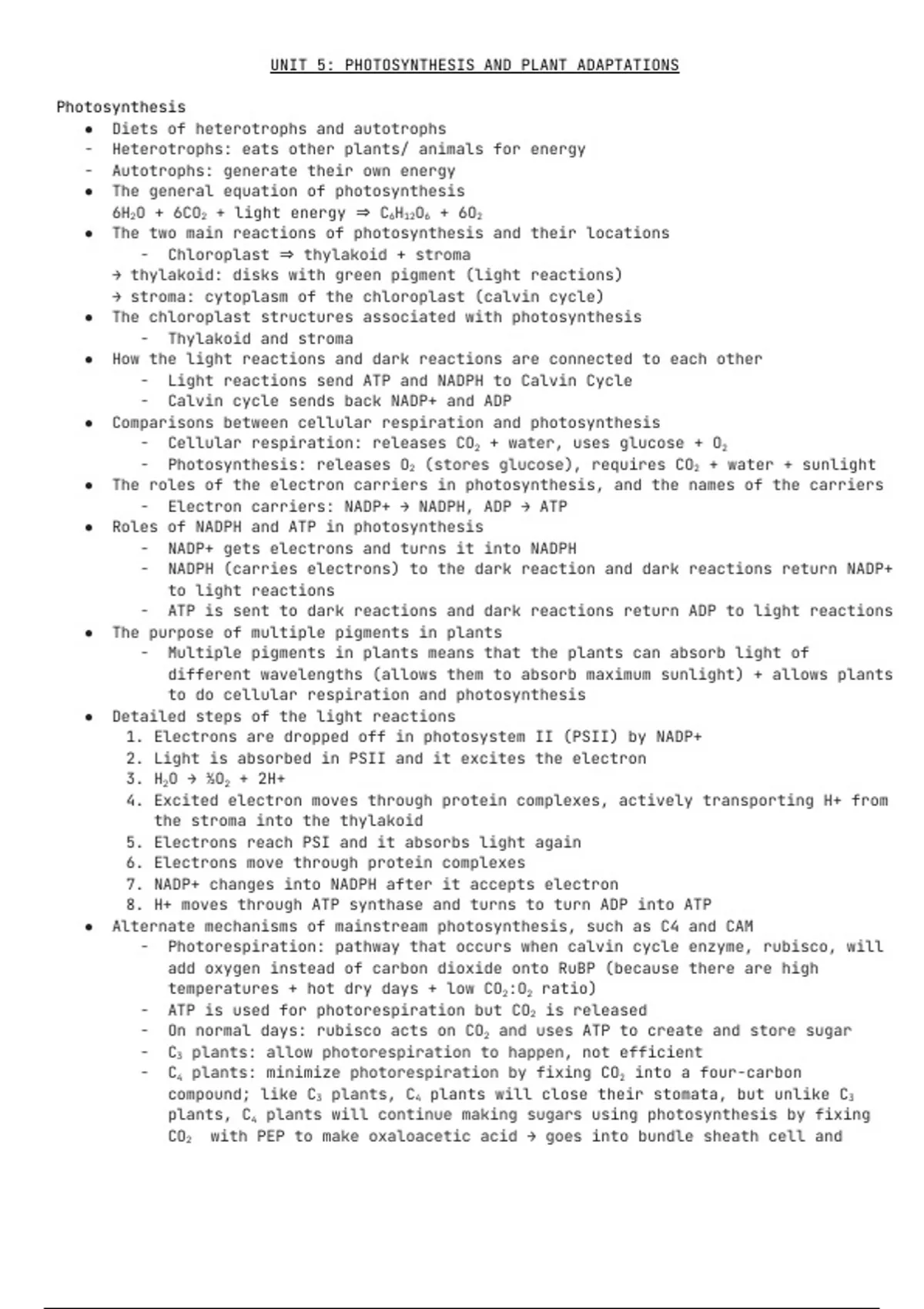 UNIT 5: PHOTOSYNTHESIS AND PLANT ADAPTATIONS
