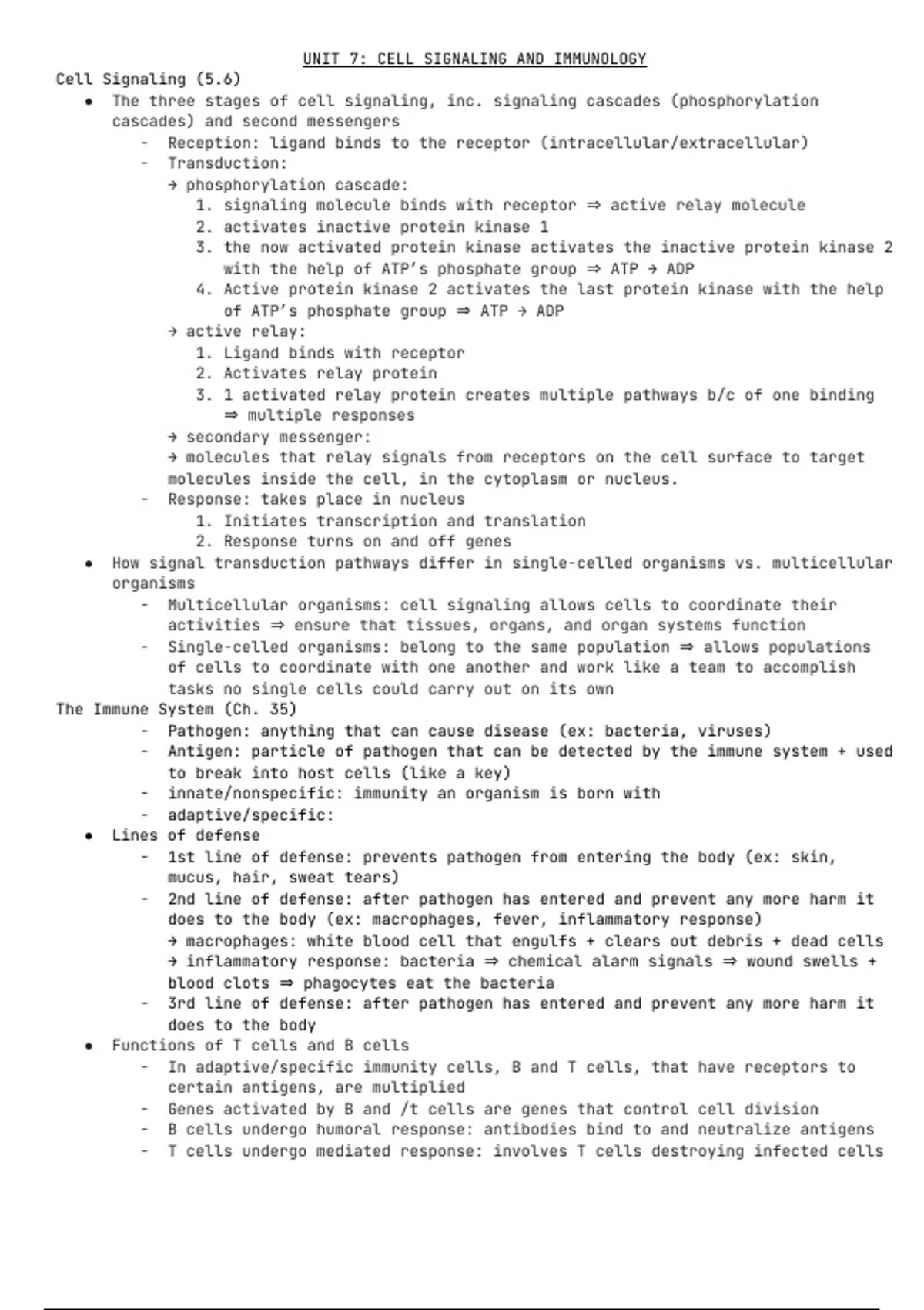 In-depth notes about cell signaling, signaling cascades, responses, functions of T cells and b cells, antibodies, antigens, humoral and cell mediated responses, hormones, and a lot more.