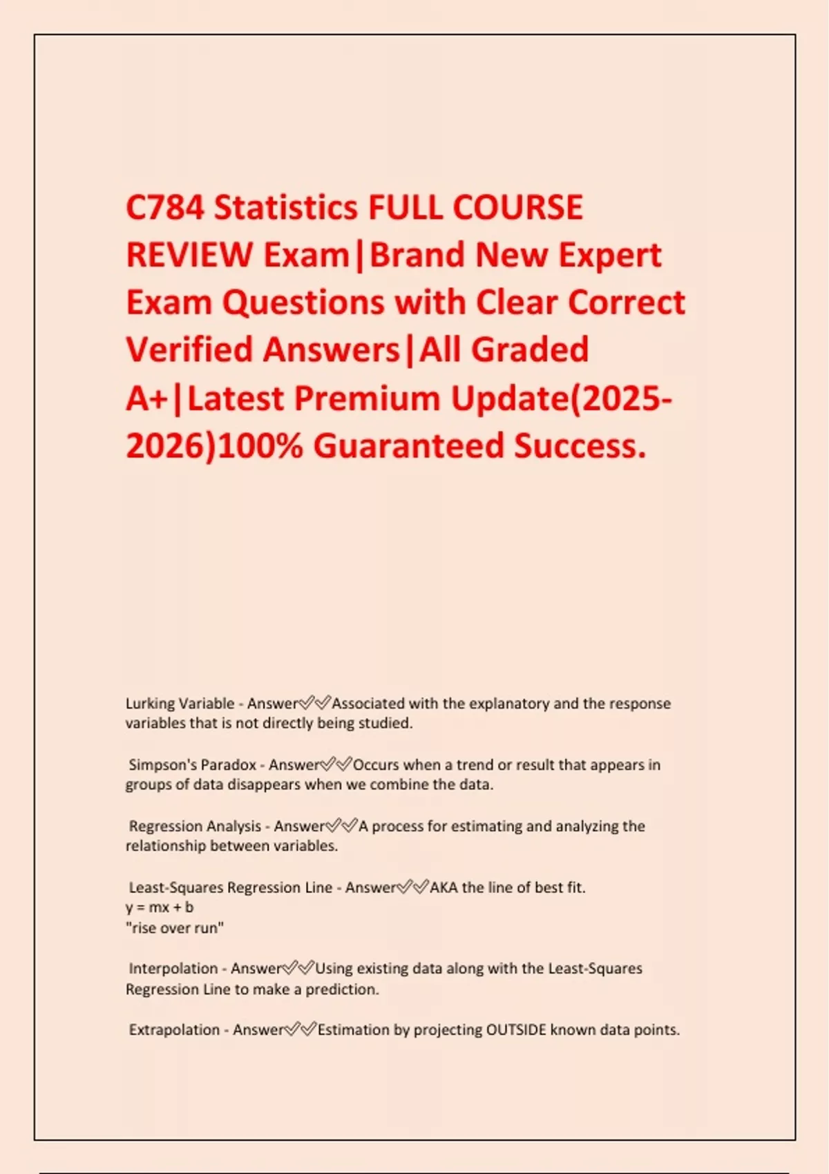 C784 Statistics FULL COURSE REVIEW Exam|Brand New Expert Exam Questions with Clear Correct Verified Answers|All Graded A+|Latest Premium Update()100% Guaranteed Success. Lurking Variable - AnswerAssociated with the explanatory and the response variables that is not directly being studied. Simpson's Paradox - AnswerOccurs when a trend or result that appears in groups of data disappears when we combine the data. Regression Analysis - AnswerA process for estimating and analyzing the relationship between variables. Least-Squares Regression Line - AnswerAKA the line of best fit. y = mx + b "rise over run" Interpolation - AnswerUsing existing data along with the Least-Squares Regression Line to make a prediction. Extrapolation - AnswerEstimation by projecting OUTSIDE known data points.