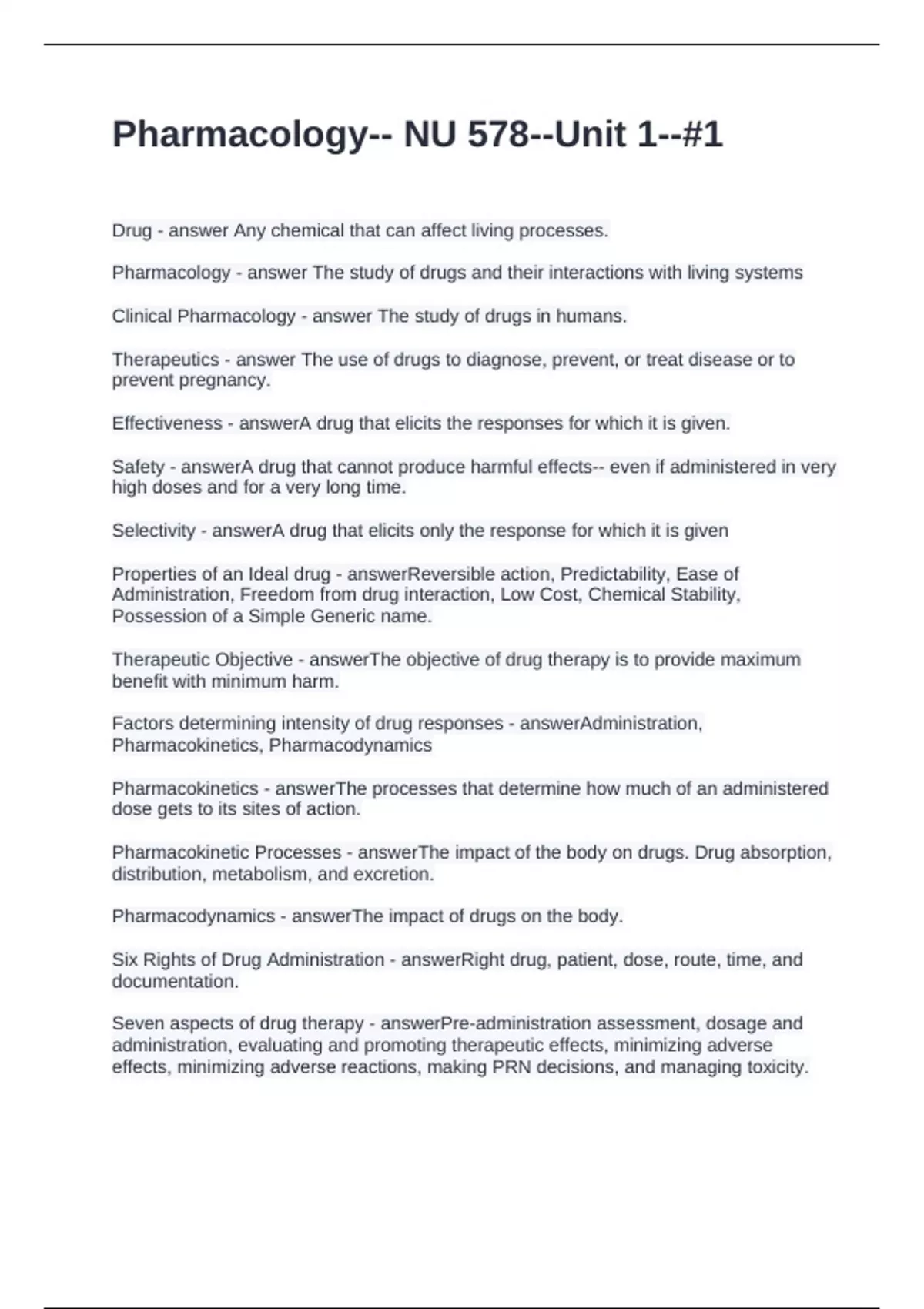 Pharmacology-- NU 578--Unit 1---1. Questions and Answers 2025
