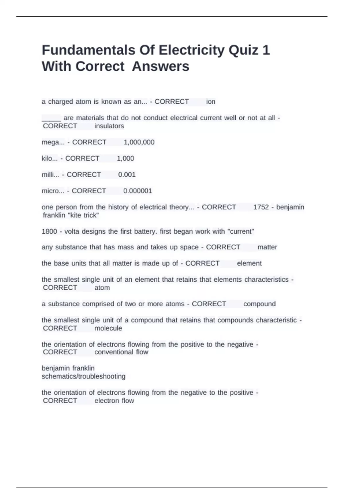 Fundamentals Of Electricity Quiz 1