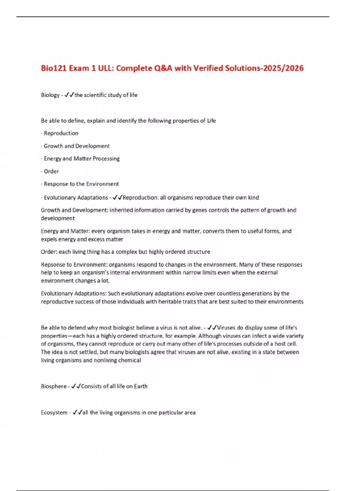 Bio121 Exam 1 ULL: Complete Q&A with Verified Solutions-2025/2026