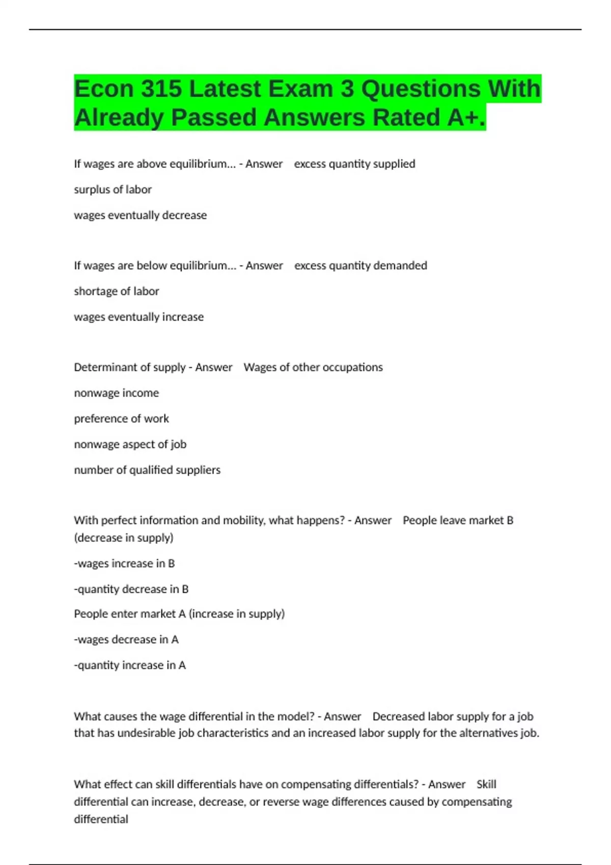 If wages are above equilibrium... - Answer excess quantity supplied surplus of labor wages eventually decrease If wages are below equilibrium... - Answer excess quantity demanded shortage of labor wages eventually increase Determinant of supply - Answer Wages of other occupations nonwage income preference of work nonwage aspect of job number of qualified suppliers With perfect information and mobility, what happens? - Answer People leave market B (decrease in supply) -wages increase in B -quantity decrease in B People enter market A (increase in supply) -wages decrease in A -quantity increase in A What causes the wage differential in the model? - Answer Decreased labor supply for a job that has undesirable job characteristics and an increased labor supply for the alternatives job. What effect can skill differentials have on compensating differentials? - Answer Skill differential can increase, decrease, or reverse wage differences caused by compensating differential Why do you think most "good" jobs also high paying - Answer Skill differential offsets compensating differential