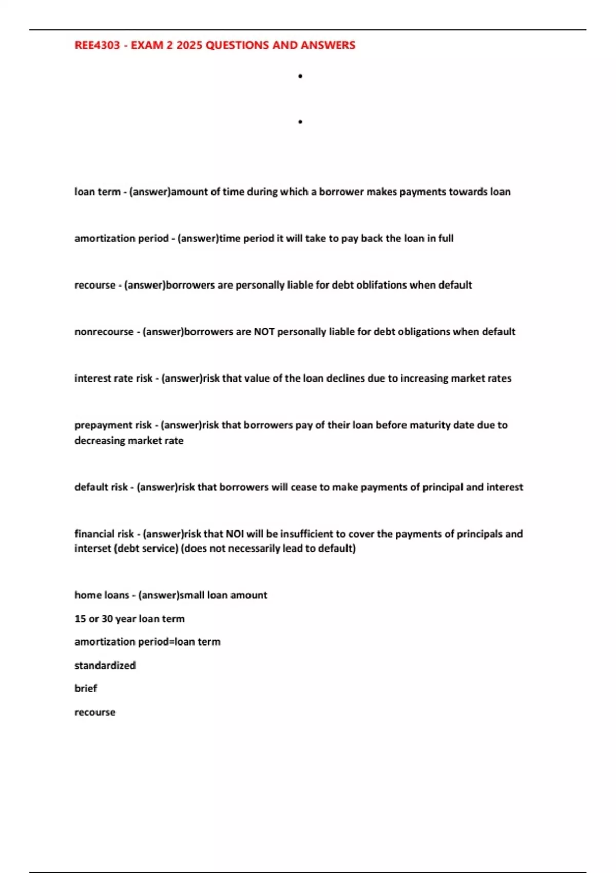 financial risk - (answer)risk that NOI will be insufficient to cover the payments of principals and