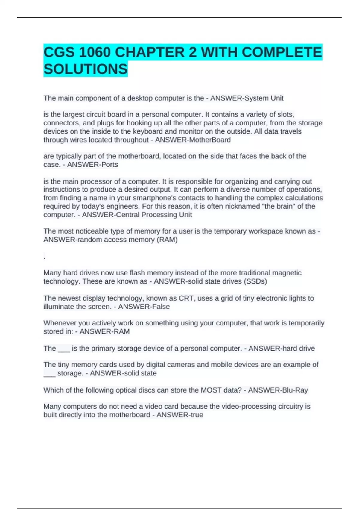 CGS 1060 CHAPTER 2 WITH COMPLETE SOLUTIONSCGS 1060 CHAPTER 2 WITH COMPLETE SOLUTIONSCGS 1060 CHAPTER 2 WITH COMPLETE SOLUTIONSCGS 1060 CHAPTER 2 WITH COMPLETE SOLUTIONSThe main component of a desktop computer is the - ANSWER-System Unit is the largest circuit board in a personal computer. It contains a variety of slots, connectors, and plugs for hooking up all the other parts of a computer, from the storage devices on the inside to the keyboard and monitor on the outside. All data travels through wires located throughout - ANSWER-MotherBoard are typically part of the motherboard, located on the side that faces the back of the case. - ANSWER-Ports