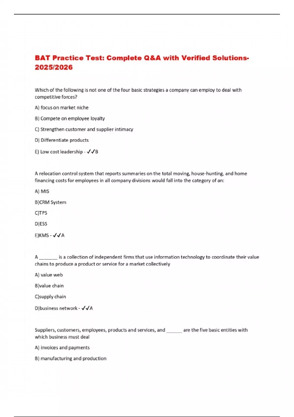 BAT Practice Test: Complete Q&A with Verified Solutions 2025/2026