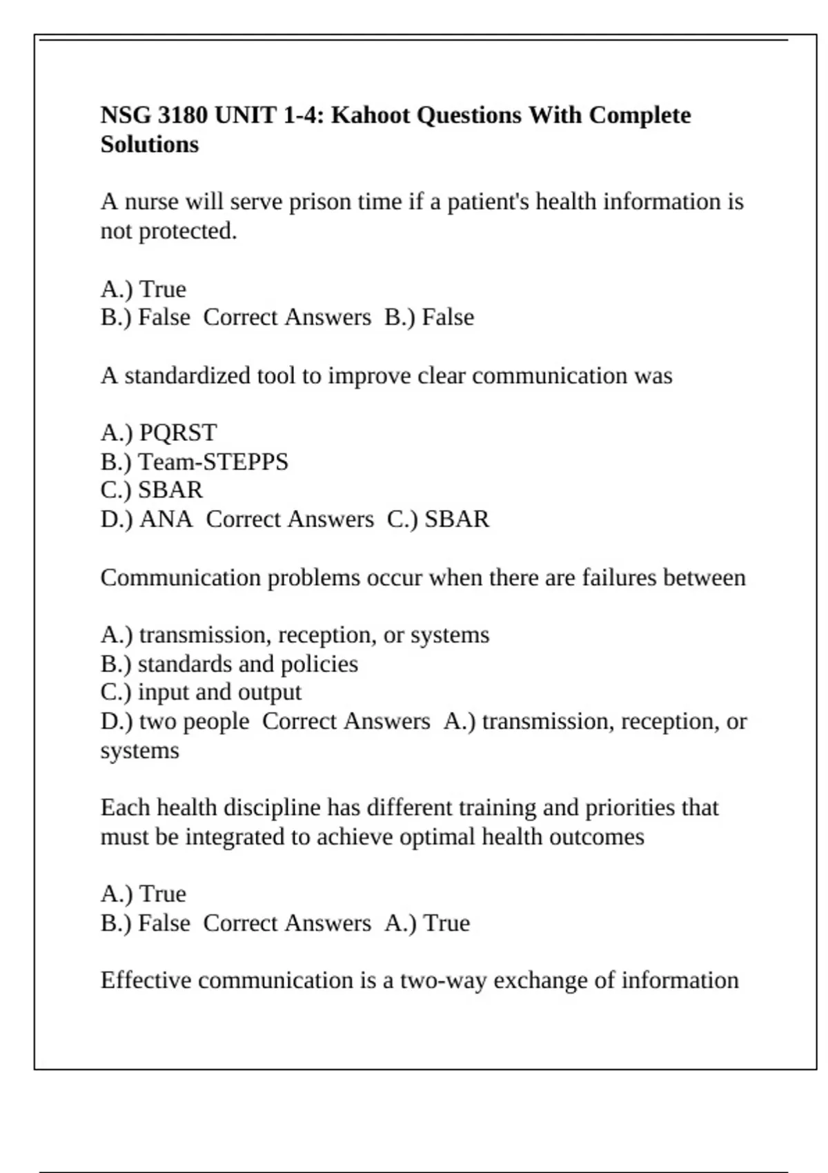 NSG 3180 UNIT 1-4: Kahoot Questions With Complete Solutions