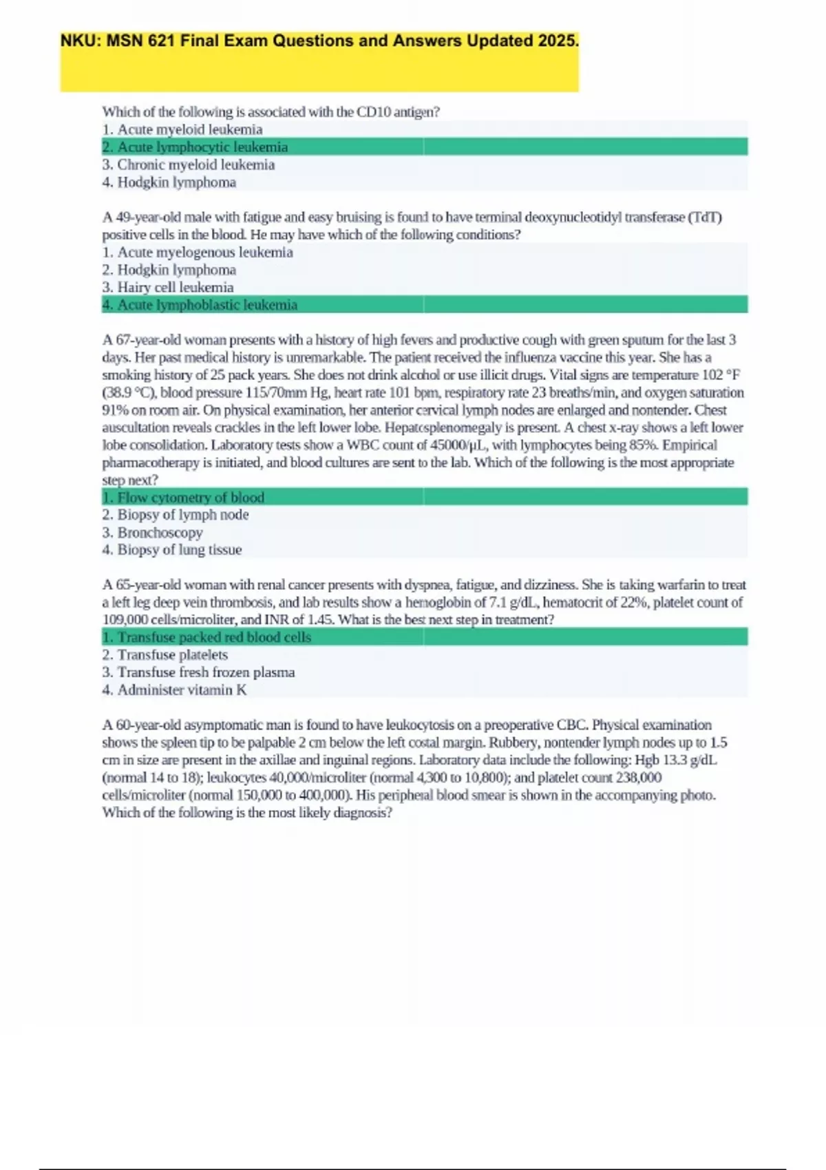 NKU: MSN 621 Final Exam Questions and Answers Updated 2025. Which of the following is associated with the CD10 antigen? 1. Acute myeloid leukemia 2. Acute lymphocytic leukemia 3. Chronic myeloid leukemia 4. Hodgkin lymphoma A 49-year-old male with fatigue and easy bruising is found to have terminal deoxynucleotidyl transferase (TdT) positive cells in the blood. He may have which of the following conditions? 1. Acute myelogenous leukemia 2. Hodgkin lymphoma 3. Hairy cell leukemia 4. Acute lymphoblastic leukemia A 67-year-old woman presents with a history of high fevers and productive cough with green sputum for the last 3 days. Her past medical history is unremarkable. The patient received the influenza vaccine this year. She has a smoking history of 25 pack years. She does not drink alcohol or use illicit drugs. Vital signs are temperature 102 °F (38.9 °C), blood pressure 115/70mm Hg, heart rate 101 bpm, respiratory rate 23 breaths/min, and oxygen saturation 91% on room air. On physical examination, her anterior cervical lymph nodes are enlarged and nontender. Chest auscultation reveals crackles in the left lower lobe. Hepatosplenomegaly is present. A chest x-ray shows a left lower lobe consolidation. Laboratory tests show a WBC count of 45000/μL, with lymphocytes being 85%. Empirical pharmacotherapy is initiated, and blood cultures are sent to the lab. Which of the following is the most appropriate step next? 1. Flow cytometry of blood 2. Biopsy of lymph node 3. Bronchoscopy 4. Biopsy of lung tissue A 65-year-old woman with renal cancer presents with dyspnea, fatigue, and dizziness. She is taking warfarin to treat a left leg deep vein thrombosis, and lab results show a hemoglobin of 7.1 g/dL, hematocrit of 22%, platelet count of 109,000 cells/microliter, and INR of 1.45. What is the best next step in treatment? 1. Transfuse packed red blood cells 2. Transfuse platelets 3. Transfuse fresh frozen plasma 4. Administer vitamin K A 60-year-old asymptomatic man is found to have leukocytosis on a preoperative CBC. Physical examination shows the spleen tip to be palpable 2 cm below the left costal margin. Rubbery, nontender lymph nodes up to 1.5 cm in size are present in the axillae and inguinal regions. Laboratory data include the following: Hgb 13.3 g/dL (normal 14 to 18); leukocytes 40,000/microliter (normal 4,300 to 10,800); and platelet count 238,000 cells/microliter (normal 150,000 to 400,000). His peripheral blood smear is shown in the accompanying photo. Which of the following is the most likely diagnosis?2 Final Exam Study Guide 1. Acute monocytic leukemia 2. Chronic myelogenous leukemia 3. Chronic lymphocytic leukemia 4. Tuberculosis A 45-year-old asymptomatic man is found to have leukocytosis on a preoperative complete blood count. His physical examination is significant for the spleen tip being palpable 2 cm below the left costal margin. Enlarged, rubbery, nontender lymph nodes up to 1.5 cm in size are present in the axillae and inguinal regions. Laboratory workup reveals a hemoglobin of 13.3 g/dL, leukocytes 40,000/microliter, and platelets 238,000/microliter. His peripheral blood smear shows mature lymphocytes with smudge cells. If he fails first-line therapy, which of the following cytogenetic changes would be an indication for stem cell transplant in this patient? 1. Trisomy 12 2. 13q deletion 3. 17p deletion 4. 19p deletion A 59-year-old male patient with a history of non-Hodgkins lymphoma treated with cyclophosphamide, adriamycin, vincristine, and prednisone eight years ago presents with a new diagnosis of myelodysplastic syndrome. Bone marrow biopsy reveals 12% blasts and greater than 10% dysplasia in the erythroid and granulocytic lineages. Fluorescence in situ hybridization (FISH) revealed monosomy 7. He asks you about the risk of transformation into acute myeloid leukemia (AML). What is the risk of treatment-related myelodysplastic syndrome transforming into AML? 1. 50% of patients will transform into AML 2. 2% of patients will transform into AML 3. 10% of patients will transform into AML 4. There is no risk of transformation into AML A 36-year-old woman with a past medical history significant for menorrhagia from uterine fibroids presents with exertional dyspnea and fatigue. Examination shows conjunctival pallor. Laboratory tests reveal a hemoglobin of 6.2 grams/dL, mean corpuscular volume (MCV) 60 fl (normal: 80-100 fl), and normal liver function tests. What is the most likely diagnosis? 1. Anemia of chronic disease 2. Vitamin B12 deficiency 3. Iron deficiency anemia 4. Acute blood loss anemia A 67-year-old woman with a performance status of 0 presents with breathlessness and fatigue. She says she has needed several blood transfusions over the past 3 months. Her hemoglobin is 7.5 g/dL, absolute neutrophil count is 1500 cells/microliter, and platelet count is 119,000 cells/microliter. A bone marrow biopsy reveals myelodysplastic3 Final Exam Study Guide syndrome (MDS) with 6% blasts and cytogenetics positive for a 5q deletion. There are no mutations or other cytogenetic abnormalities. What is the best initial treatment for this patient? 1. An erythropoietin-stimulating agent 2. A thalidomide derivative 3. A hypomethylating agent 4. Allogeneic hematopoietic stem cell transplant A 65-year-old woman presents with an 8-month history of recurrent low-grade fevers, a 3-month history of abdominal fullness, and more recently, fatigue and moderately reduced exercise tolerance. Before this, she was in good health with no major medical conditions. Upon examination, she appeared to be stable and in no acute distress. She has a heart rate of 95 bpm and blood pressure of 128/60 mmHg. She had several palpable cervical and axillary lymph nodes (1-2 cm) that were non-tender and freely mobile. She also had palpable splenomegaly. No other abdominal masses/hepatomegaly appreciated on examination. Her complete blood count showed a leukocyte count of 32,000/mm3, hemoglobin of 9.8 g/dL, plate