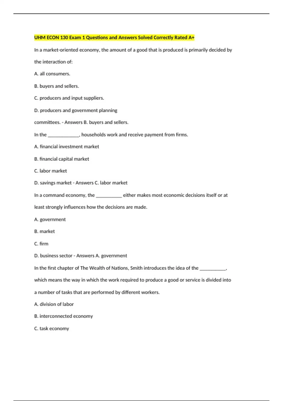 ,D. modern economy - Answers A. division of labor