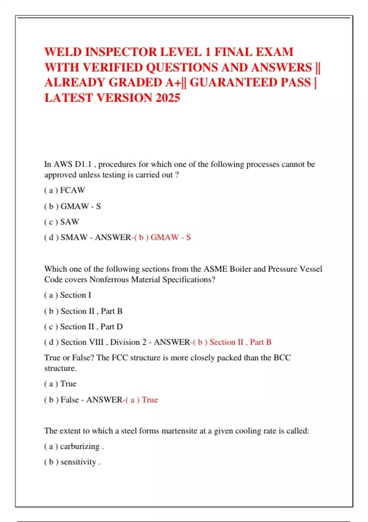 WELD INSPECTOR LEVEL 1 FINAL EXAM WITH VERIFIED QUESTIONS AND ANSWERS || ALREADY GRADED A+|| GUARANTEED PASS | LATEST VERSION 2025 In AWS D1.1 , procedures for which one of the following processes cannot be approved unless testing is carried out ? ( a ) FCAW ( b ) GMAW - S ( c ) SAW ( d ) SMAW - ANSWER-( b ) GMAW - S Which one of the following sections from the ASME Boiler and Pressure Vessel Code covers Nonferrous Material Specifications? ( a ) Section I ( b ) Section II , Part B ( c ) Section II , Part D ( d ) Section VIII , Division 2 - ANSWER-( b ) Section II , Part B True or False? The FCC structure is more closely packed than the BCC structure. ( a ) True ( b ) False - ANSWER-( a ) True The extent to which a steel forms martensite at a given cooling rate is called: ( a ) carburizing . ( b ) sensitivity . ( c ) hardenability . ( d ) temperability . - ANSWER-( c ) hardenability . True or False? Normalizing of steel involves heating into the fully austenite region followed by furnace cooling. ( a ) True ( b ) False - ANSWER-( b ) False Hot rolling is carried out: ( a ) below the lower transformation temperature . ( b ) between 723 ° C and 912 ° C . ( c ) in the austenite / ferrite region . ( d ) in the fully austenitic region . - ANSWER-( d ) in the fully austenitic region . Tempering martensite involves reheating to a temperature: ( a ) in the austenite / ferrite region . ( b ) in the fully austenitic region . ( c ) above the lower transformation temperature of 723 ° C . ( d ) below the lower transformation temperature of 723 ° C . - ANSWER-( d ) below the lower transformation temperature of 723 ° C . According to CSA Standard W59 , at what distance from the weld must the minimum preheat be maintained in 44 mm thick plate ? ( a ) 44 mm ( b ) 50 mm ( c ) 75 mm ( d ) 88 mm - ANSWER-( c ) 75 mm Visual inspection of inaccessible areas may be carried out with the use of : ( a ) gauges . ( b ) magnifying glasses . ( c ) lasers . ( d ) boroscopes . - ANSWER-( d ) boroscopes .